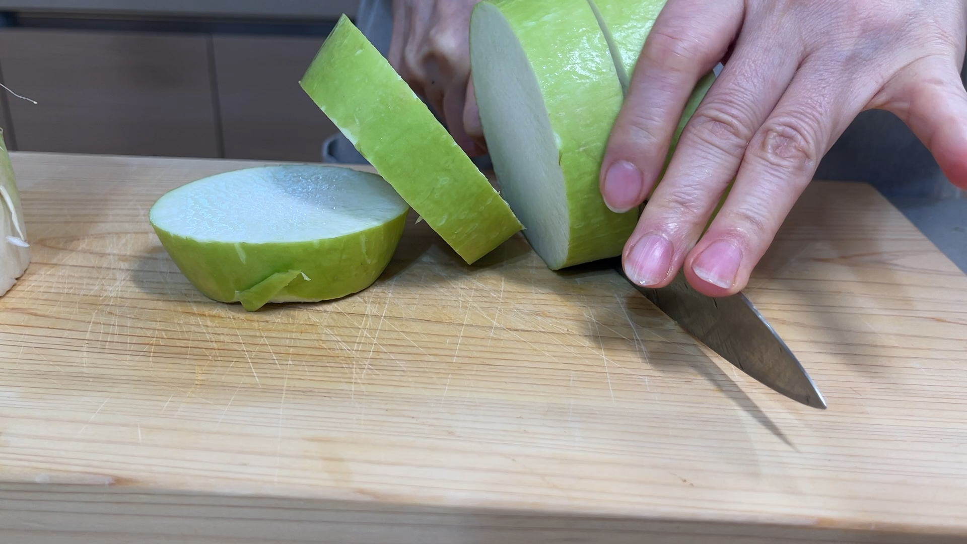 | 1. 무를 믹서기에 갈기 좋은 크기로 썰어 준다. |