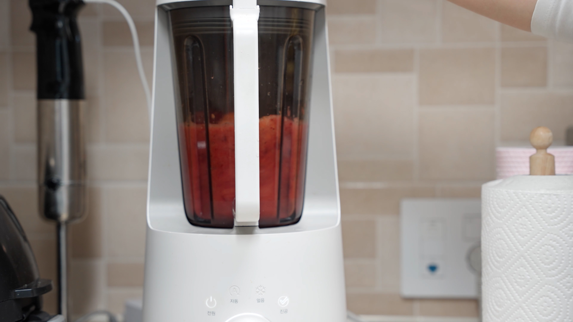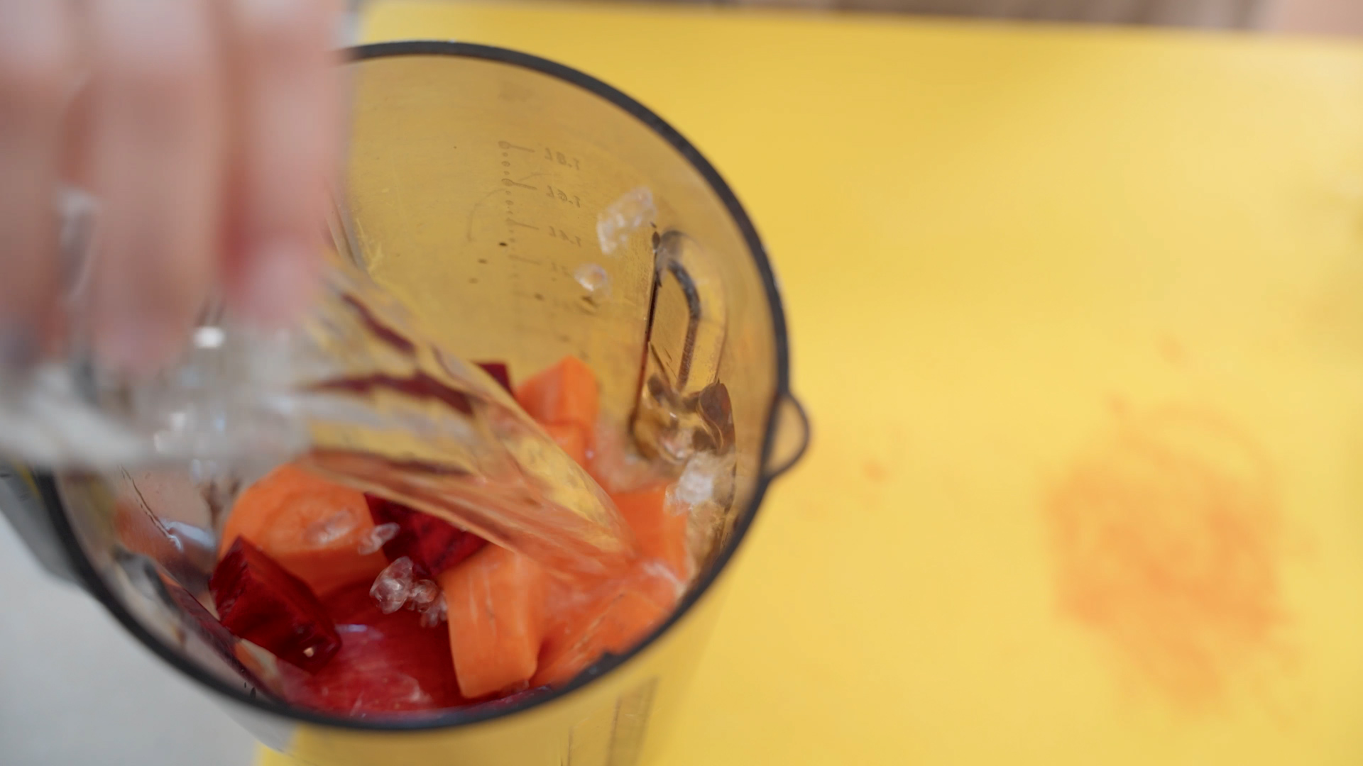 4.썬 재료를 믹서기에 넣고 물 한컵(200ml)을 넣어 갈아 준다.