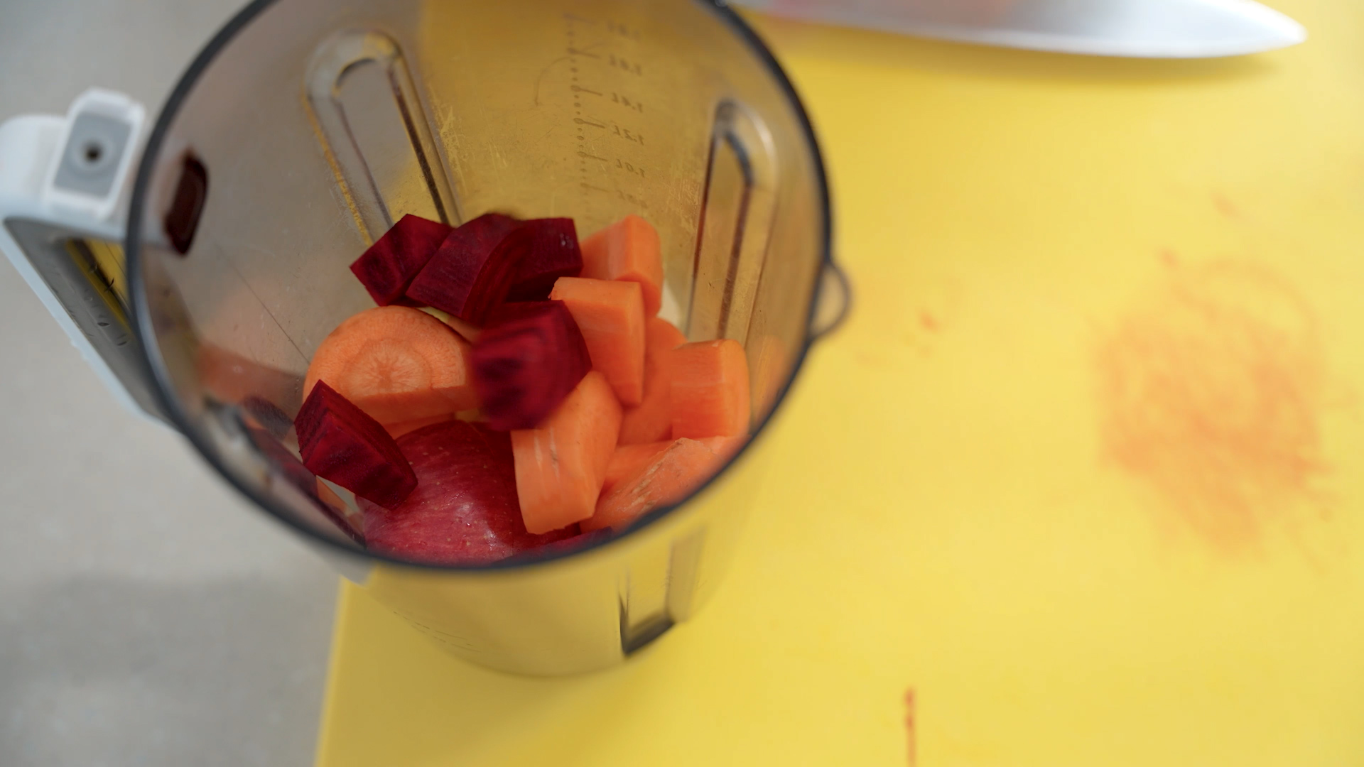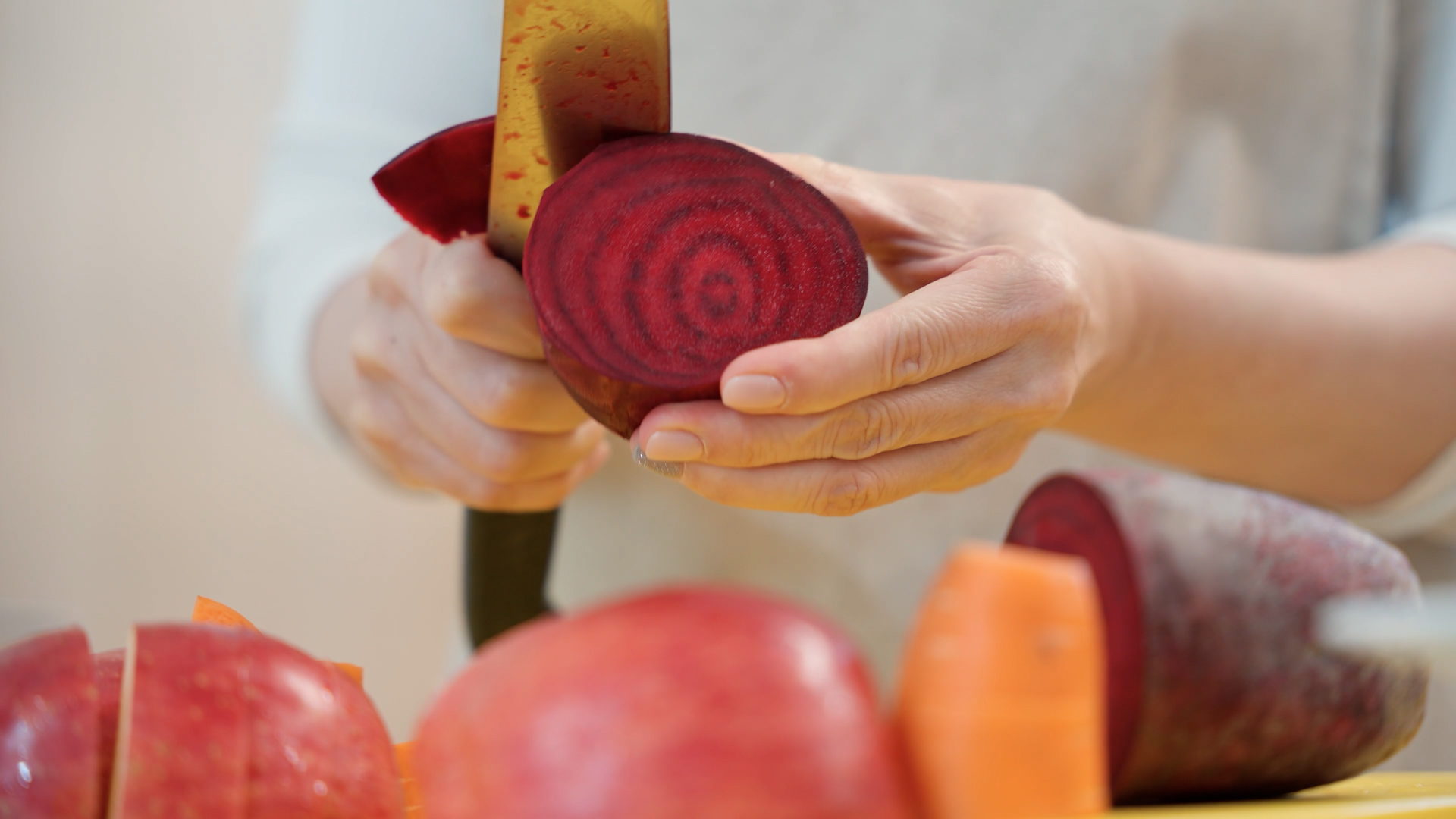사과, 비트, 당근을 일정 비율로 넣어 갈아 만듭니다.