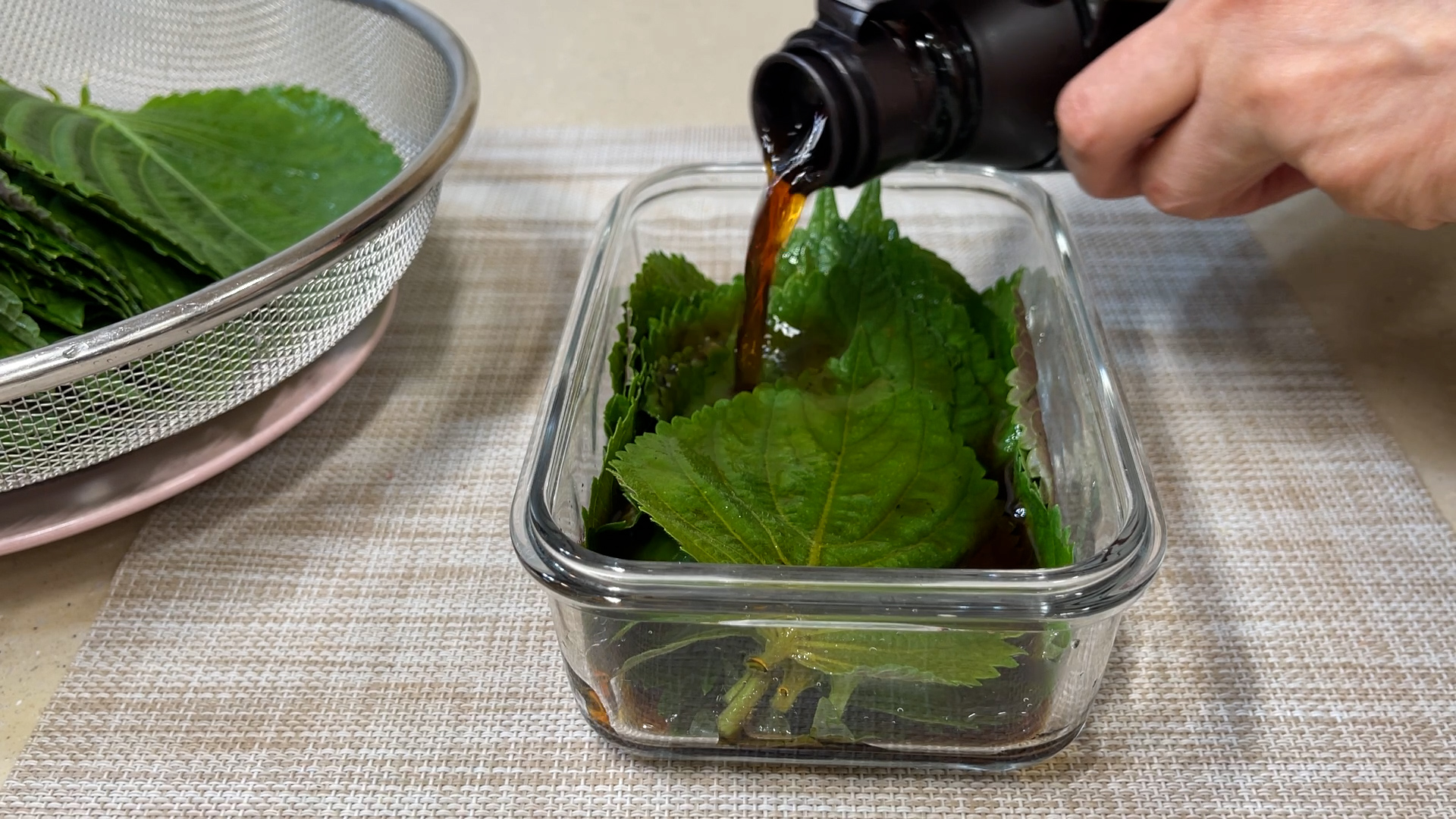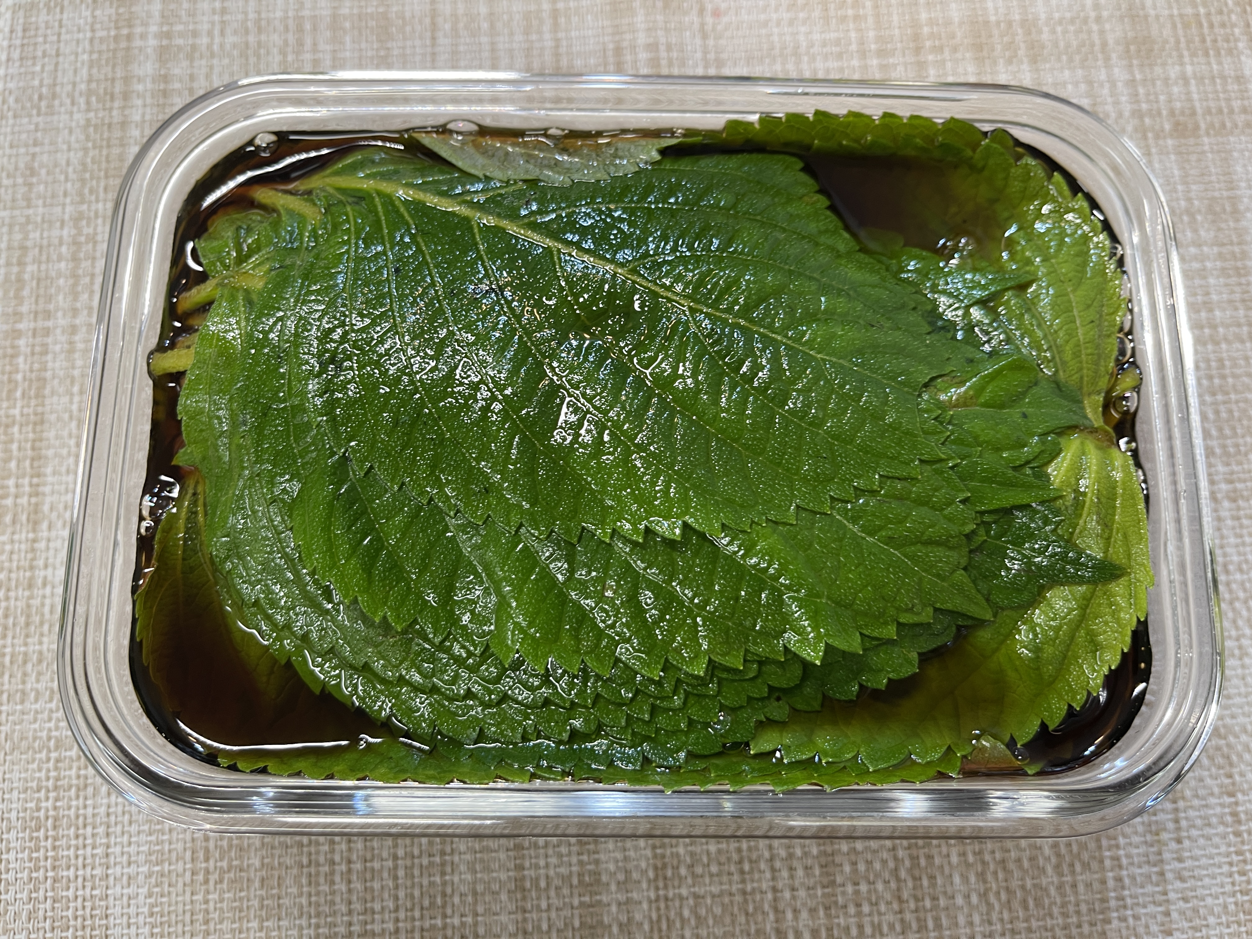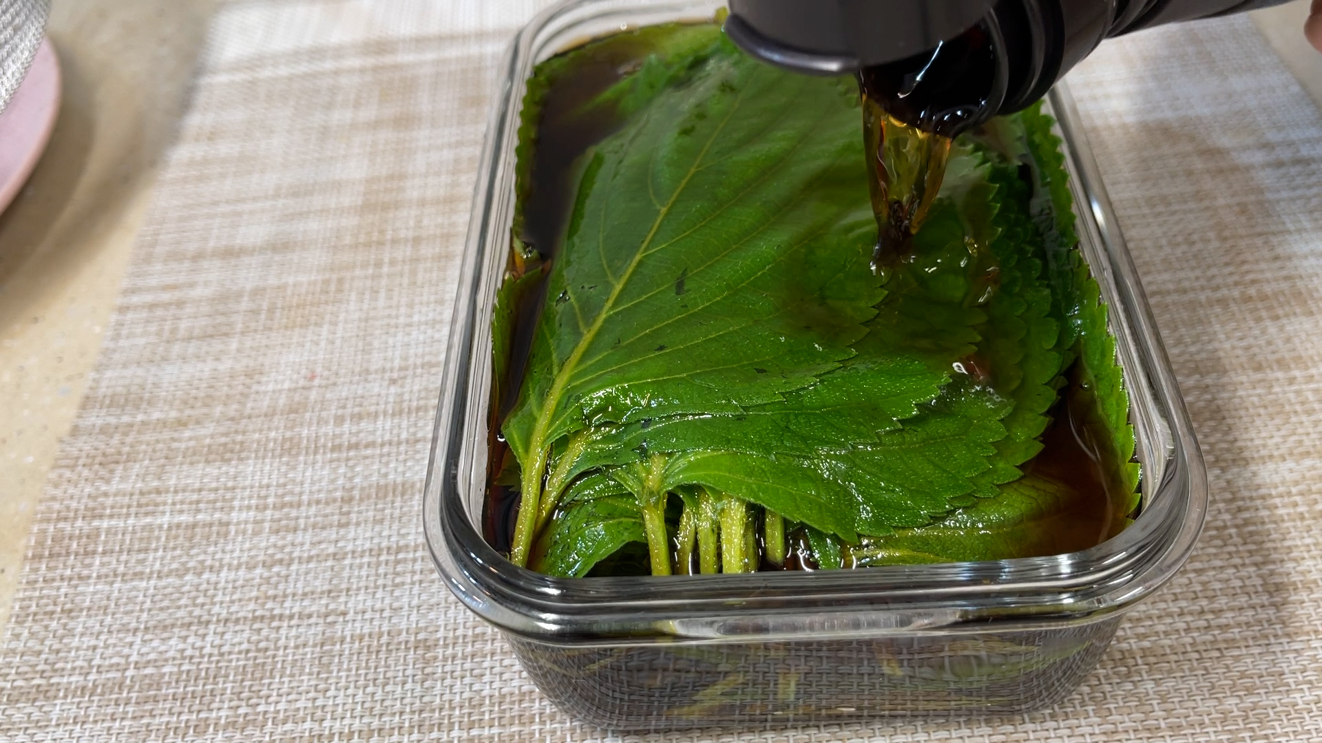 3.장아찌 담을 통에 깻잎은 놓고 장아찌용소스를 잠길정도로 부어준다.