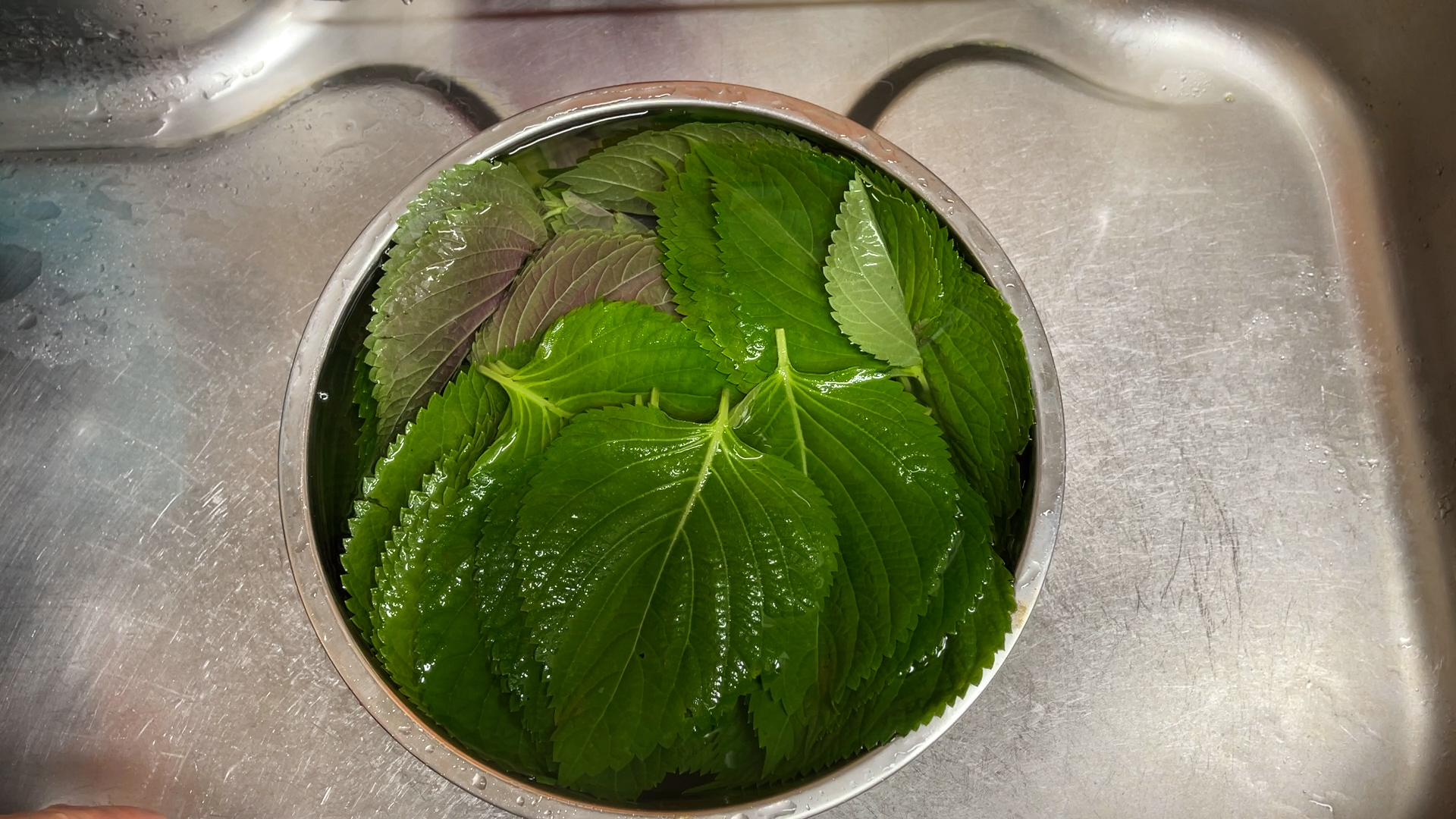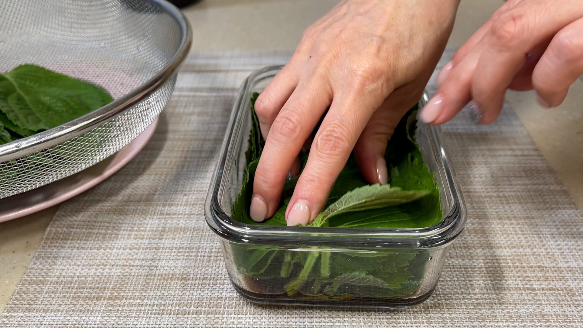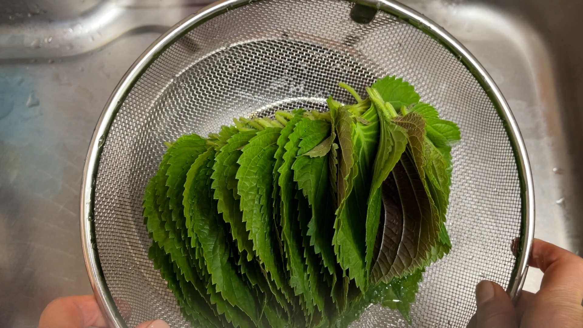 2.깻잎을 물기가 빠지도록 채반위에 비스듬히 놓아둔다.