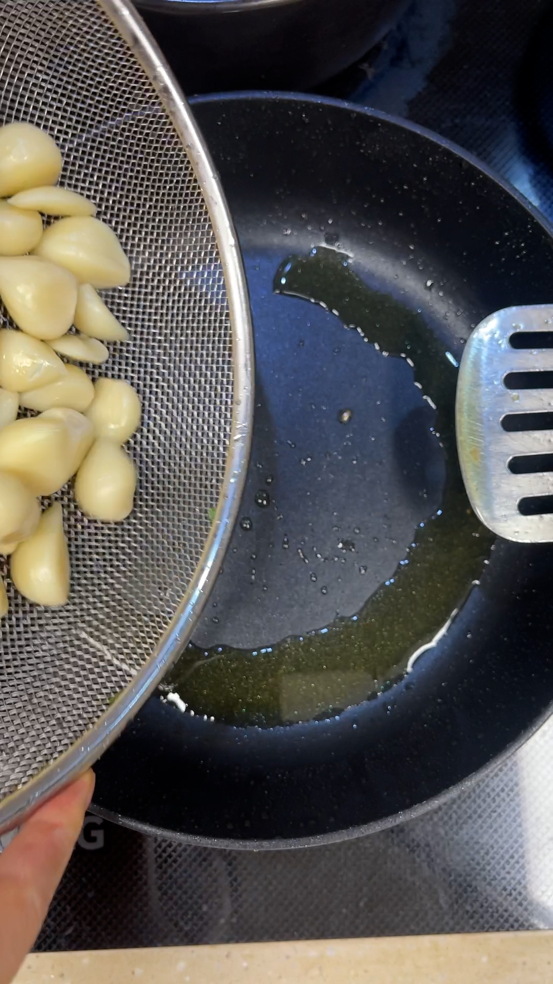 4. 프라이팬에 올리브유 넣고 마늘 넣어 중불에서 노릇노릇 익혀 준다.