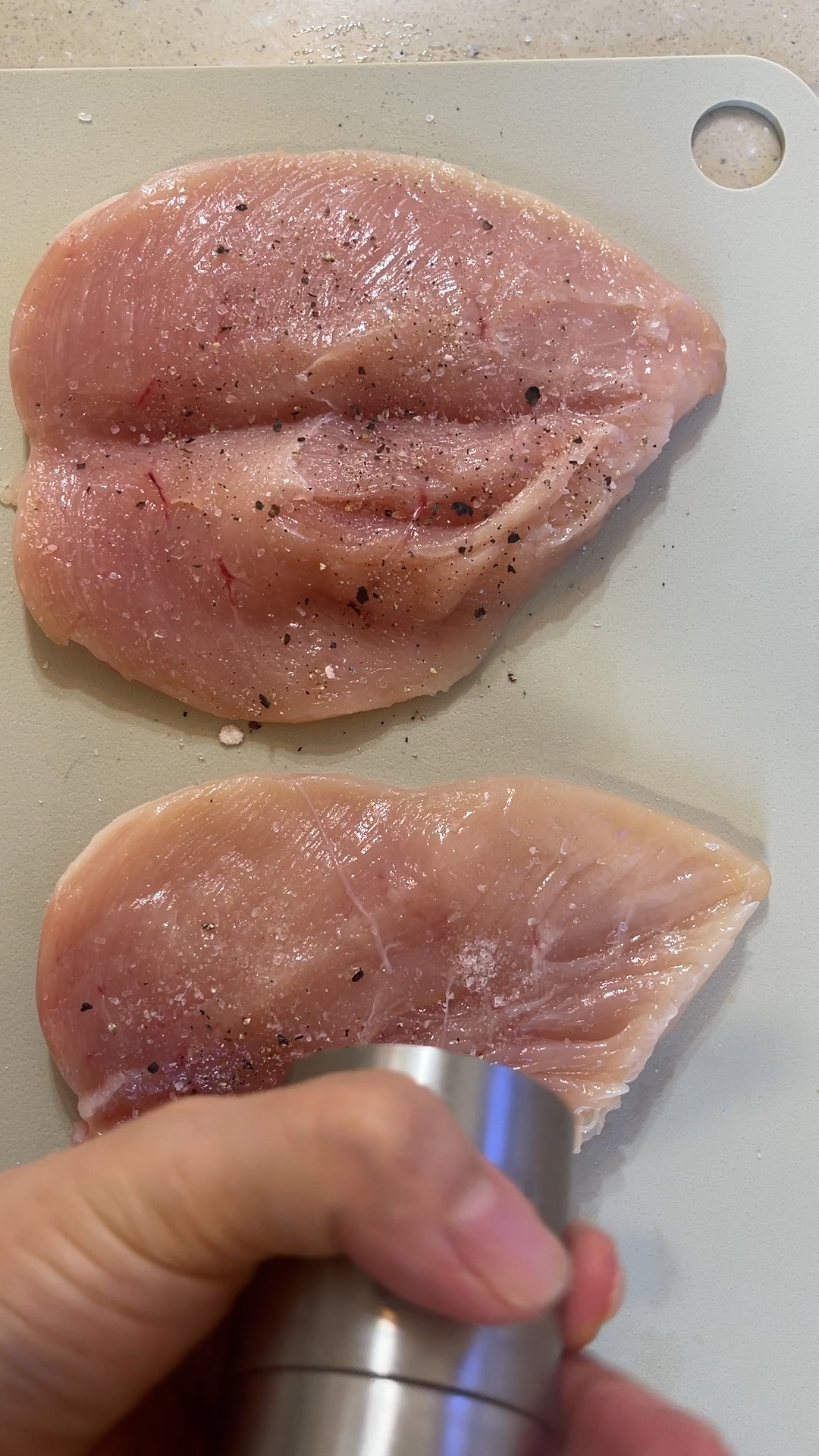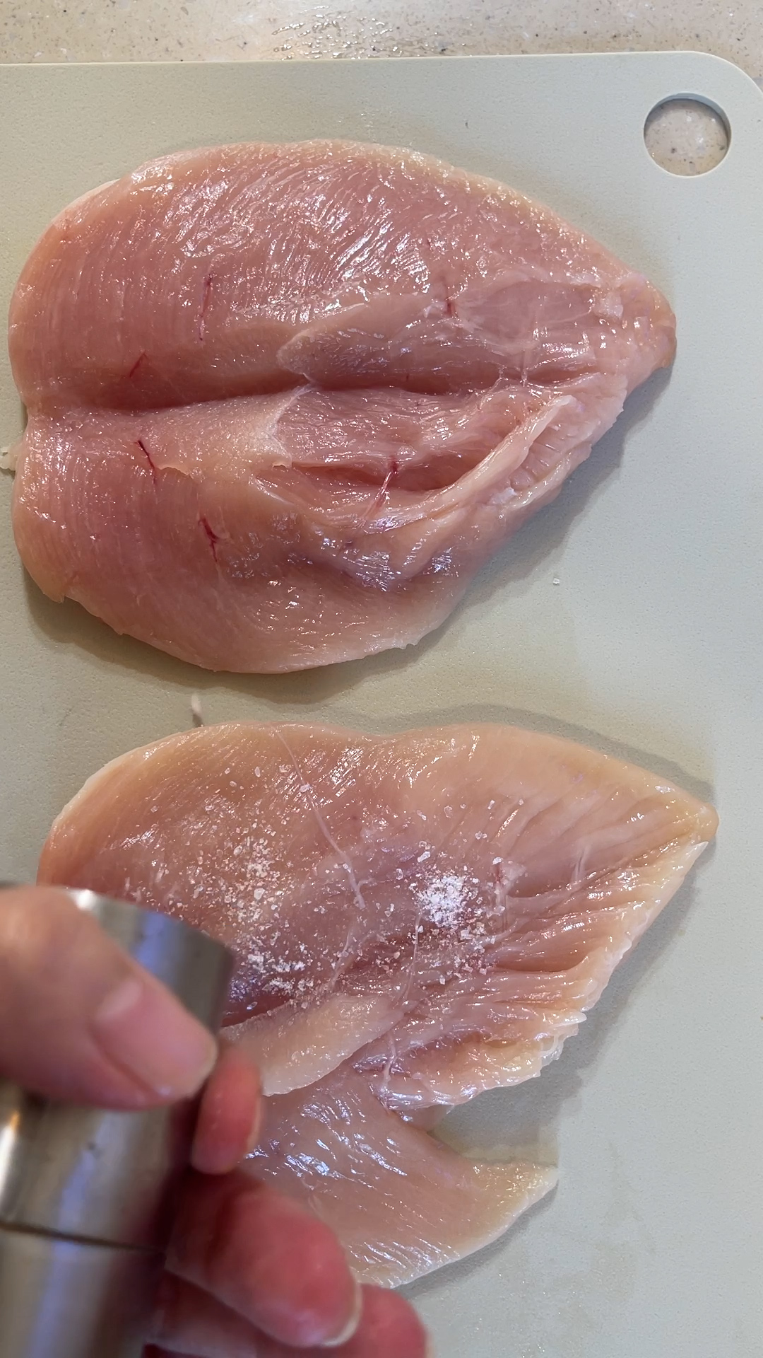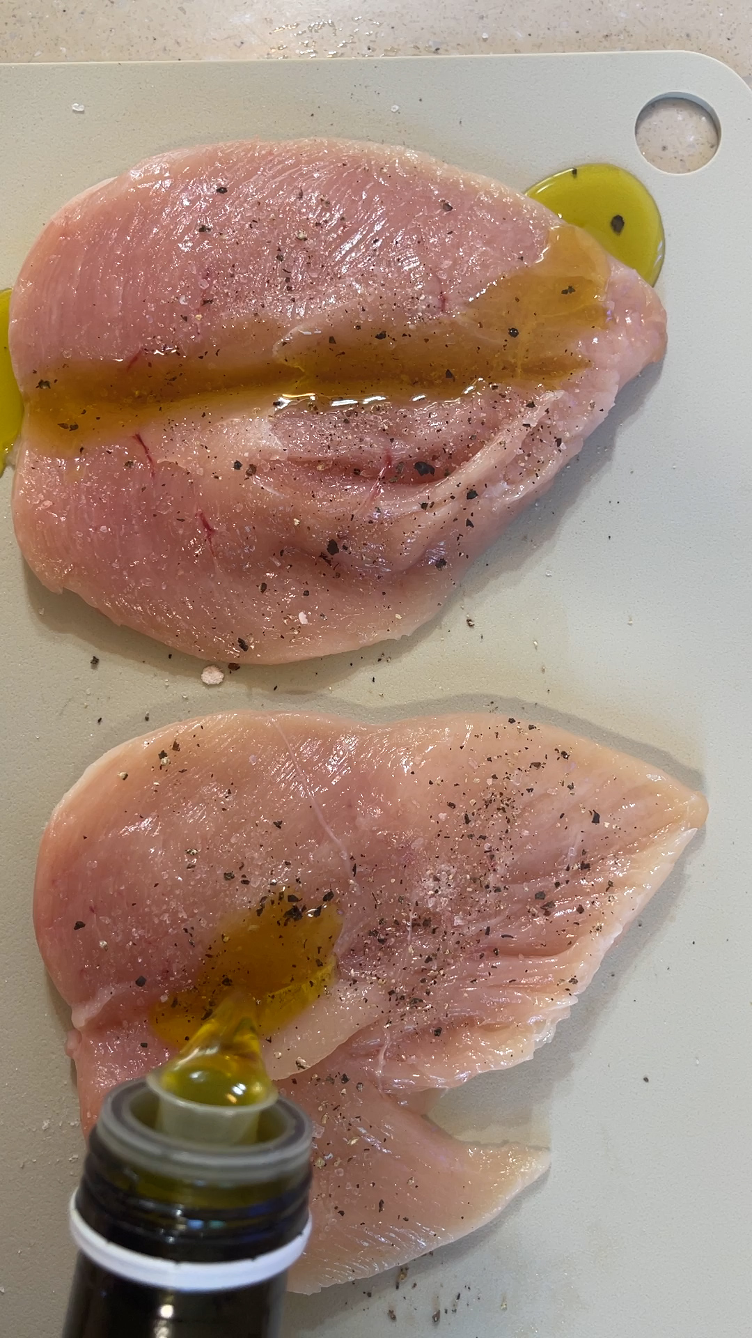 3. 닭가슴살에 소금, 후추, 기본 양념을 골고루 뿌린 후, 올리브 오일을 앞뒤로 발라준다.
