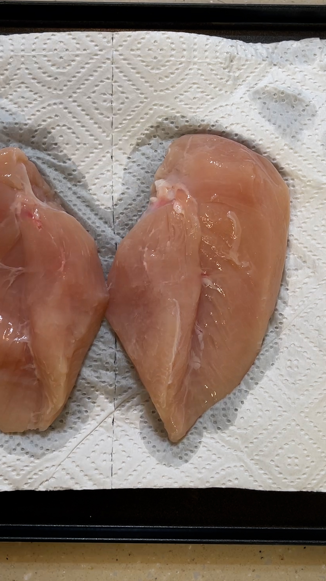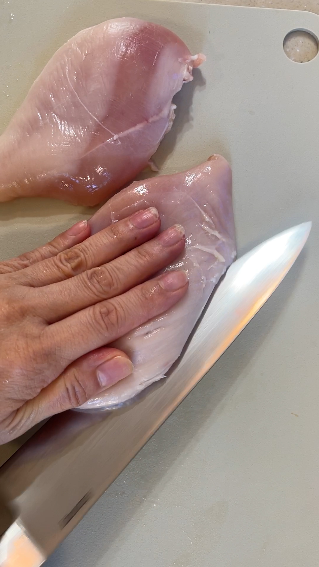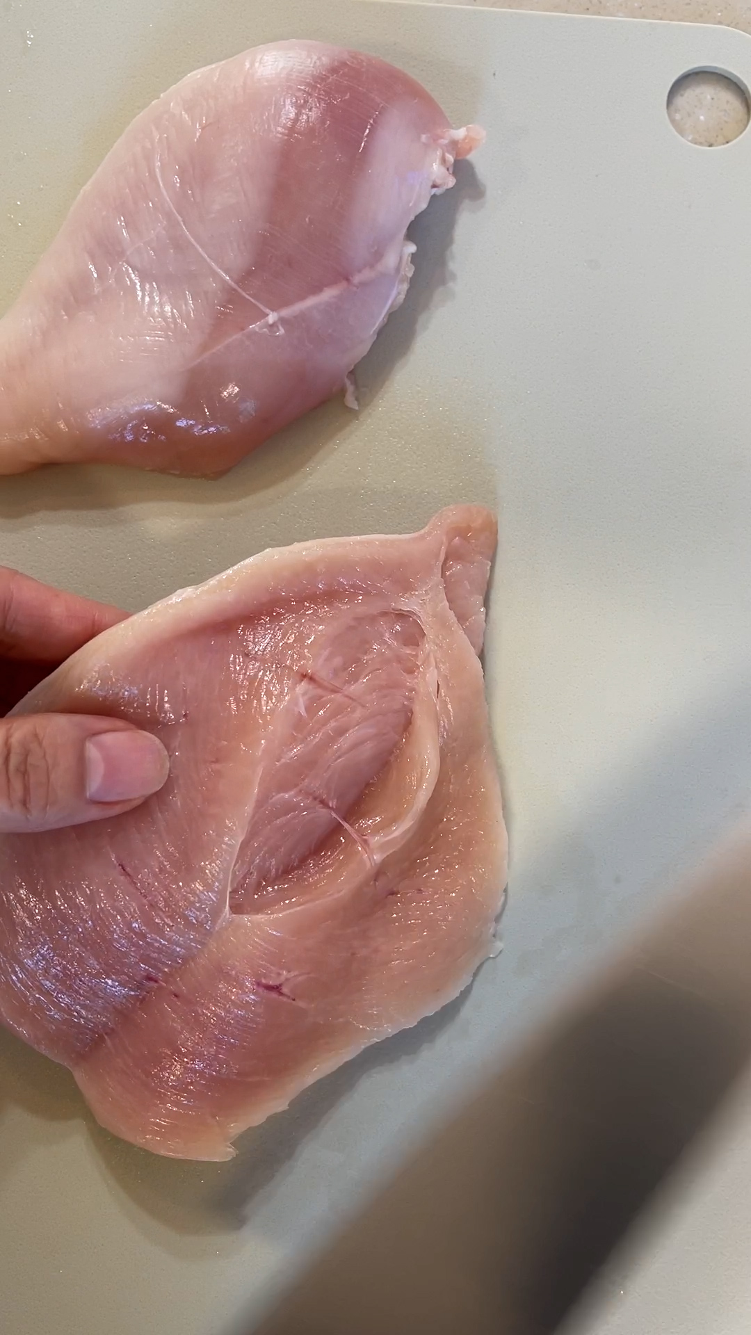 2. 닭가슴살의 도톰한 부분을 얇게 반으로 잘라 준다.