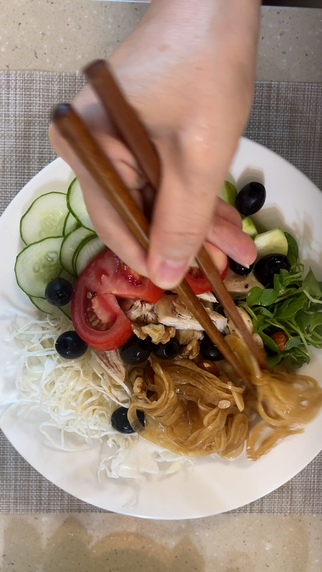 5. 닭가슴살을 결대로 찢거나 가위로 잘라 샐러드와 함께 맛있게 먹는다.