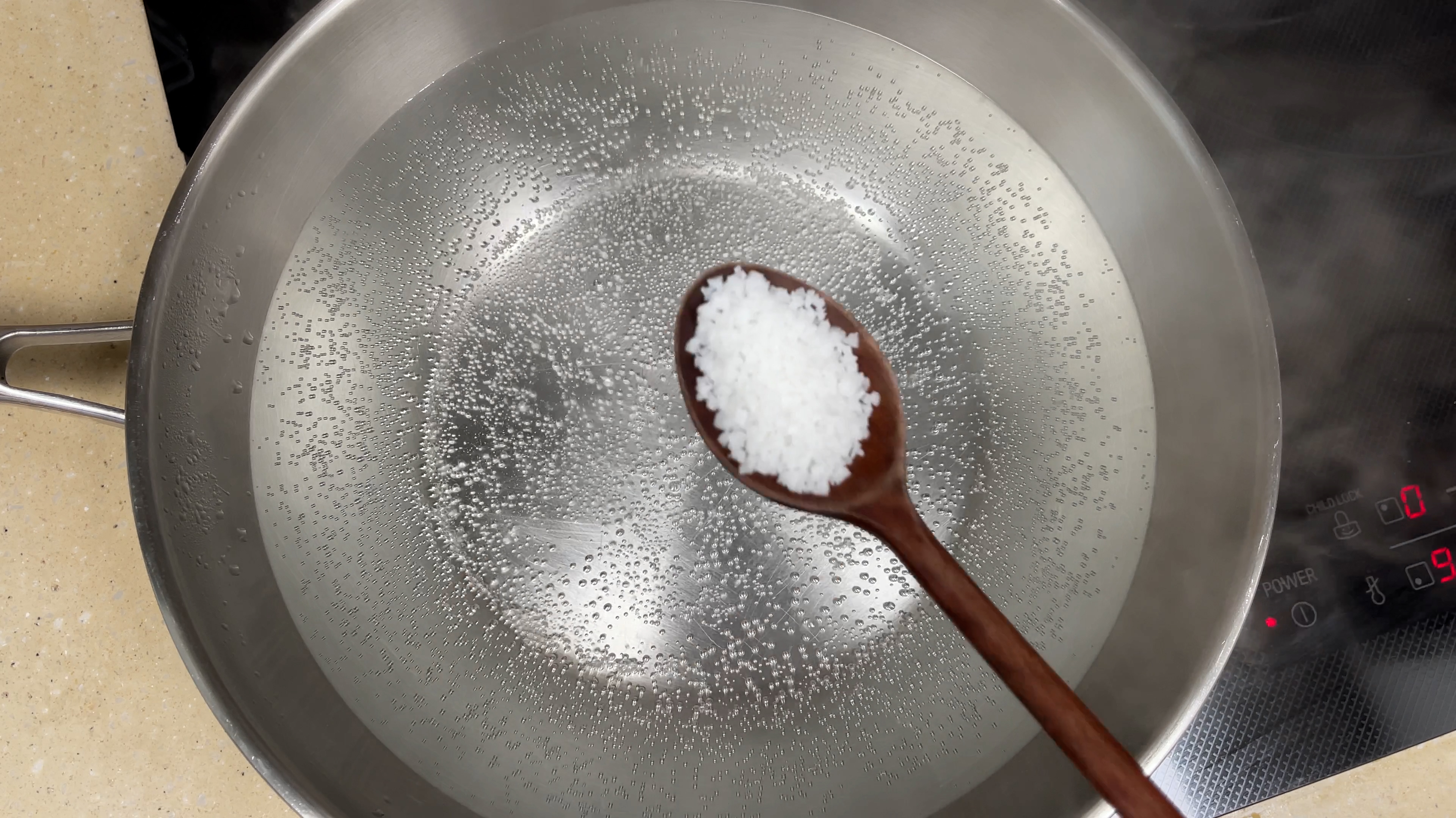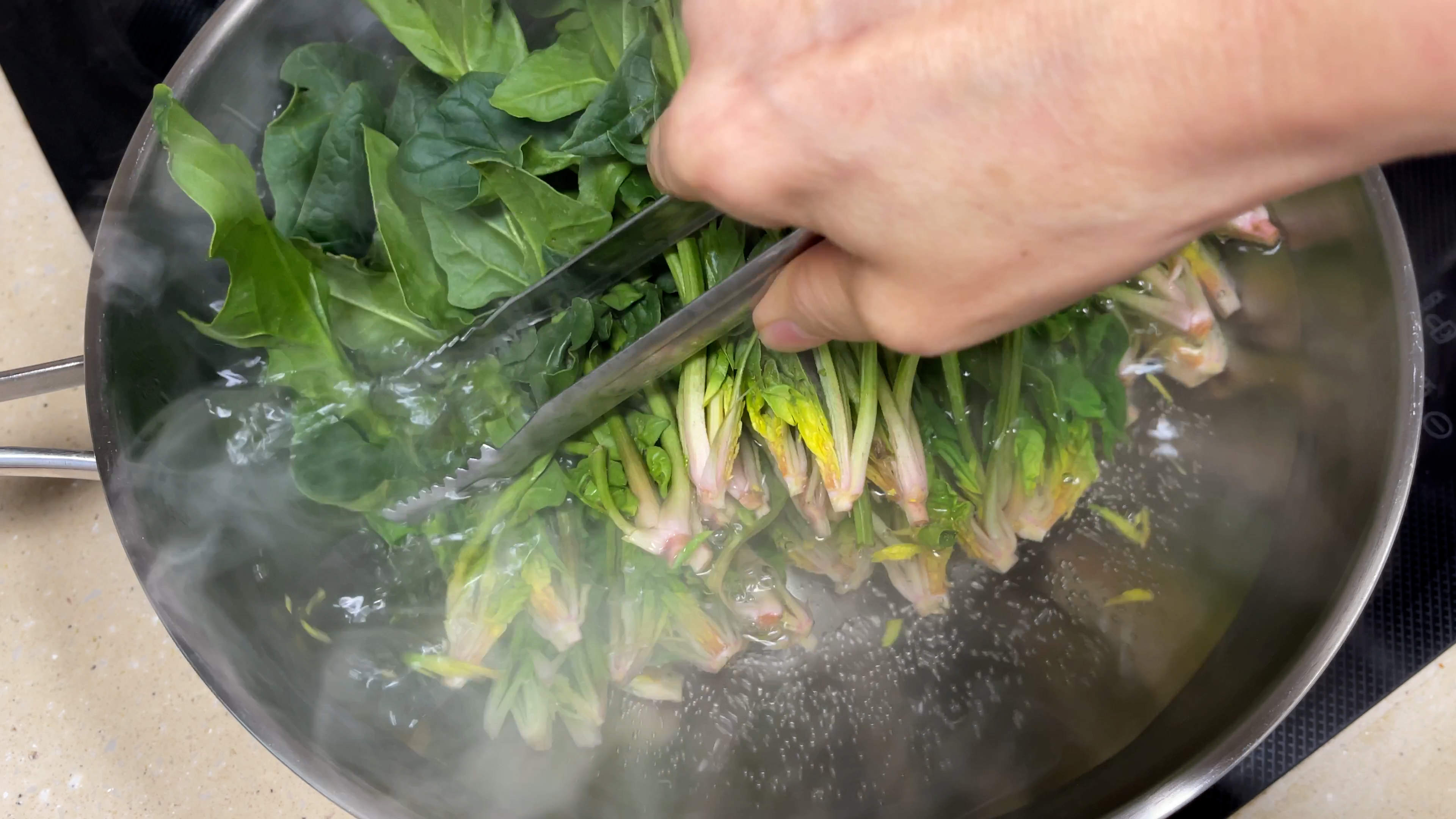 2. 물이 끓으면 굵은 소금 1 T 넣고 30초 이내로 데친다(뿌리쪽부터 넣는다).