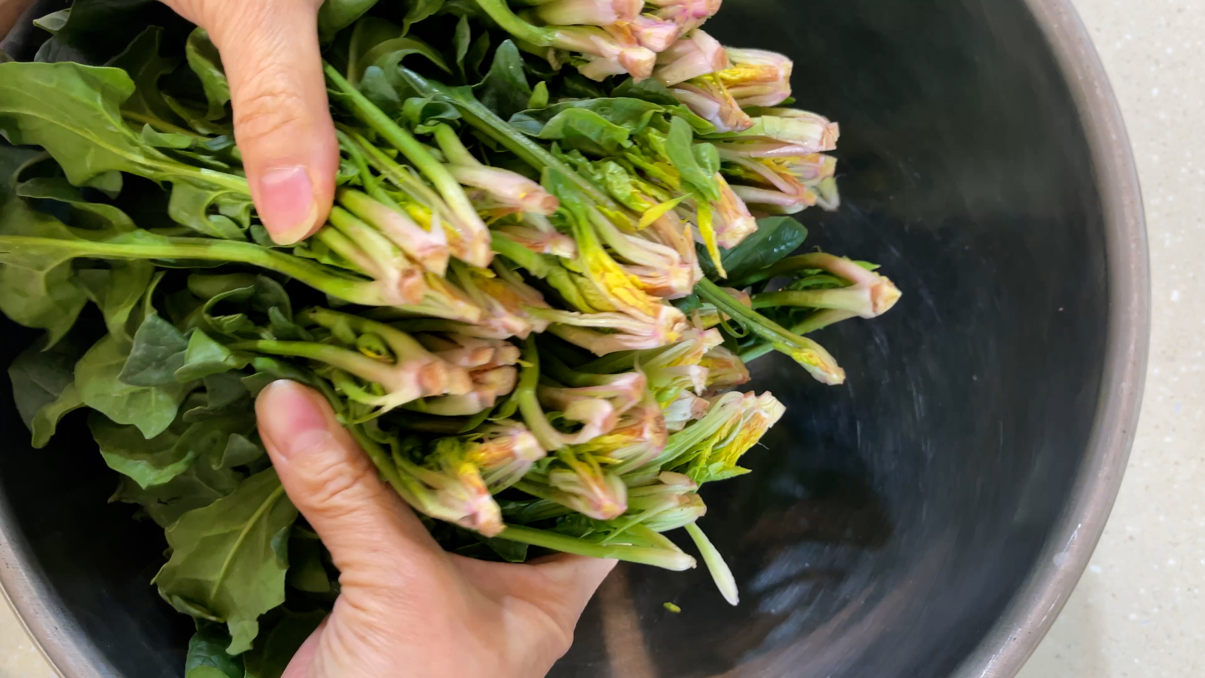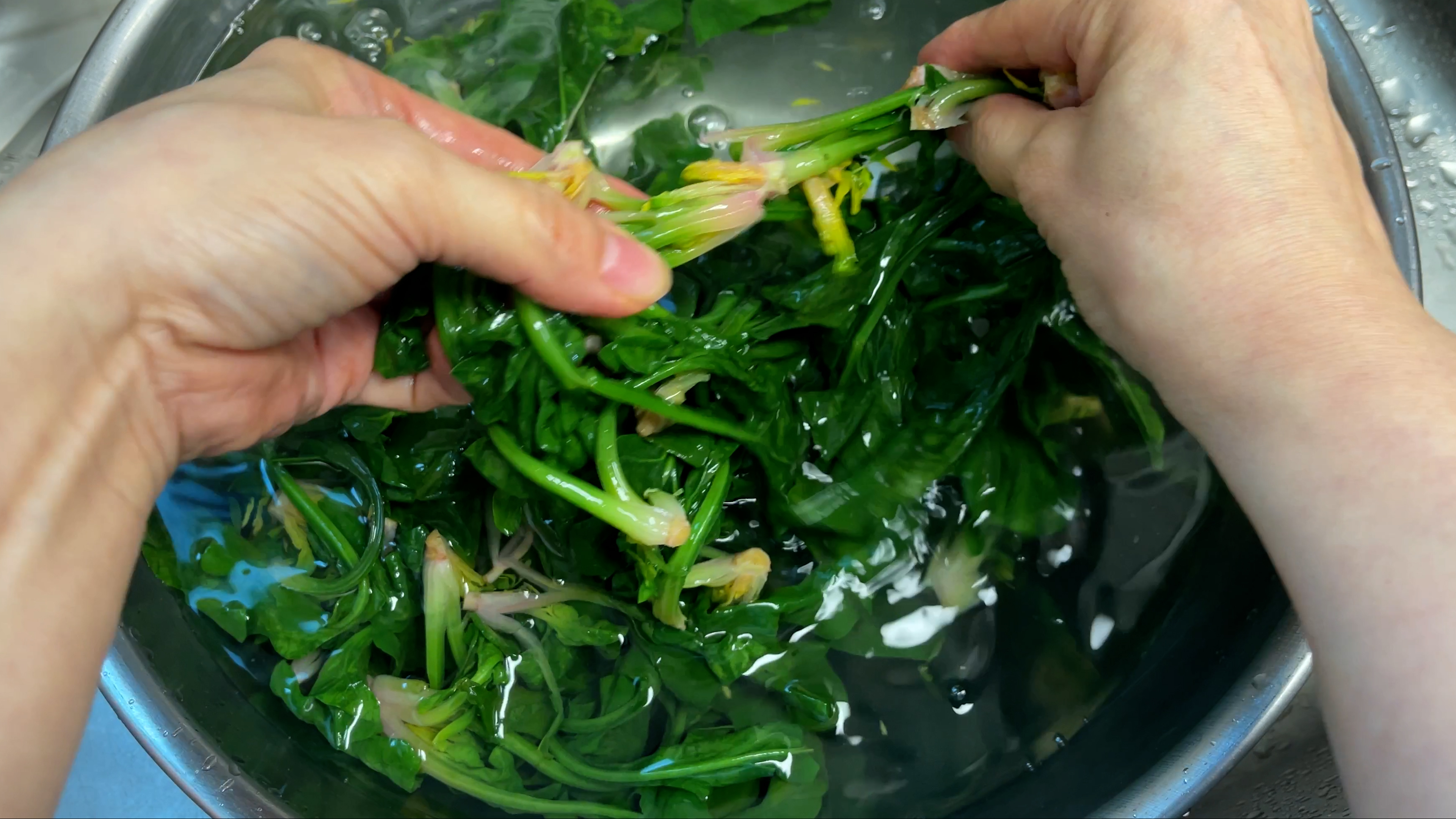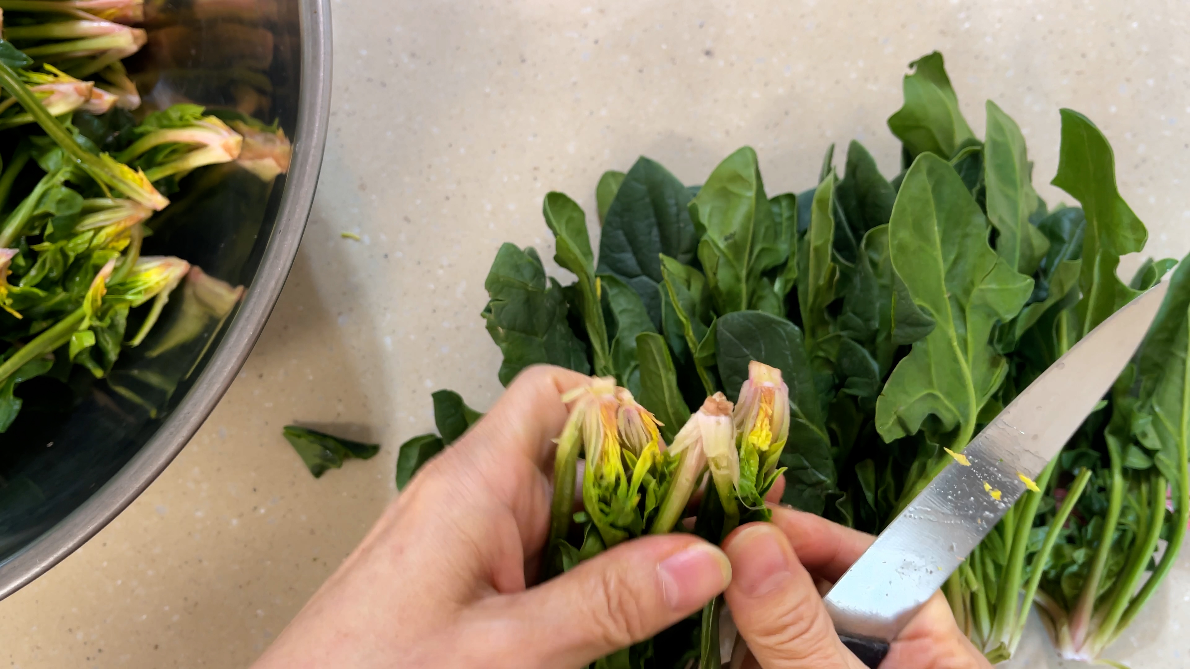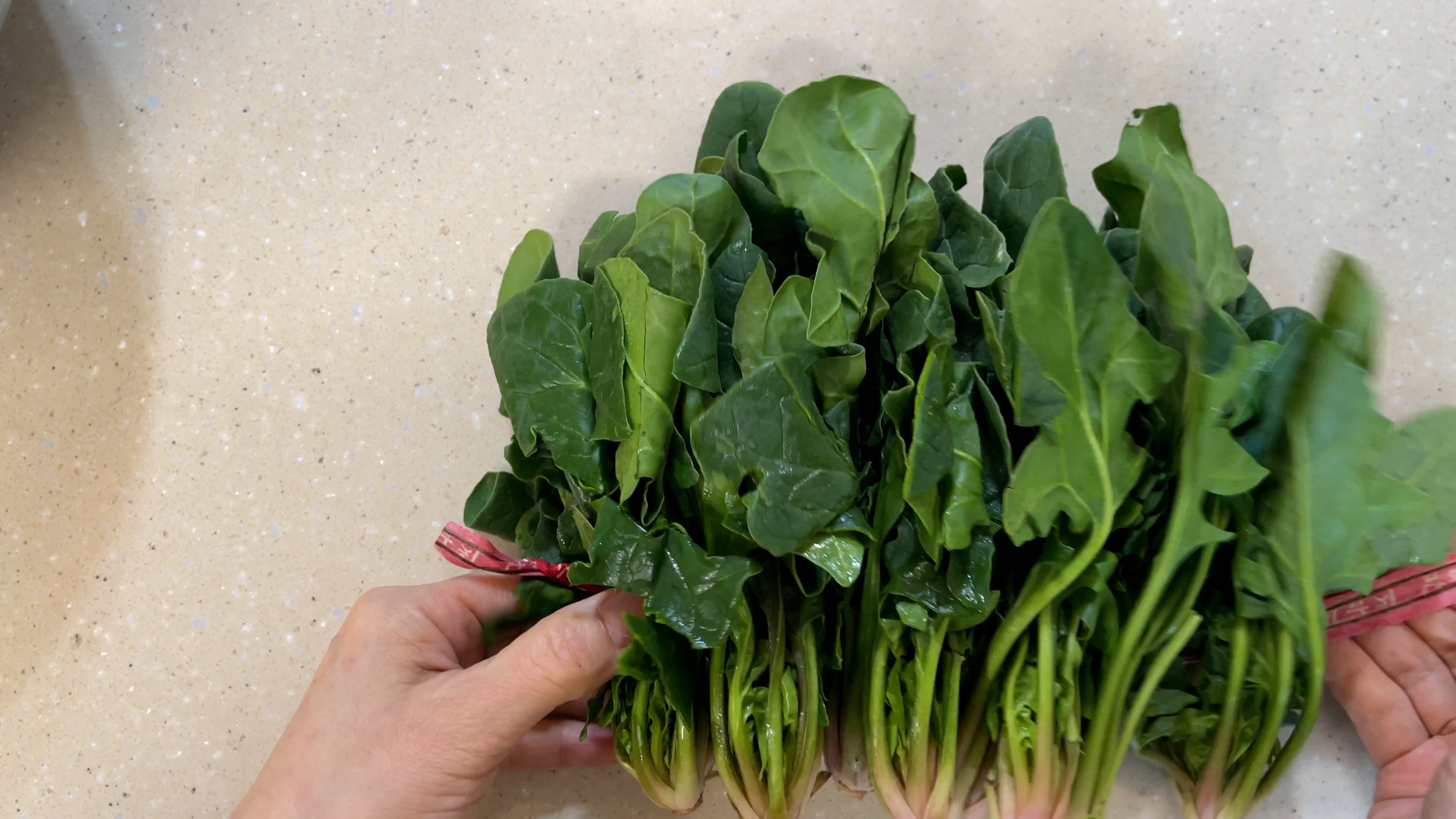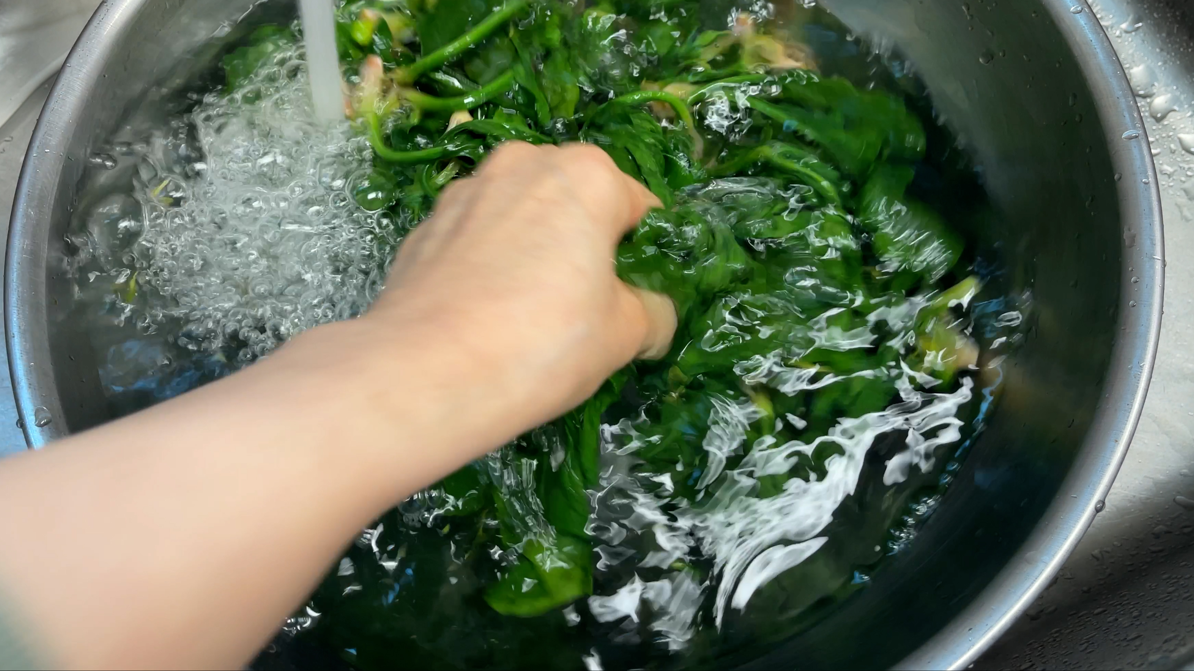 1. 시금치를 다듬는다( 누런잎은 정리하고, 뿌리는 섭취). 냄비에 물을 끓인다.