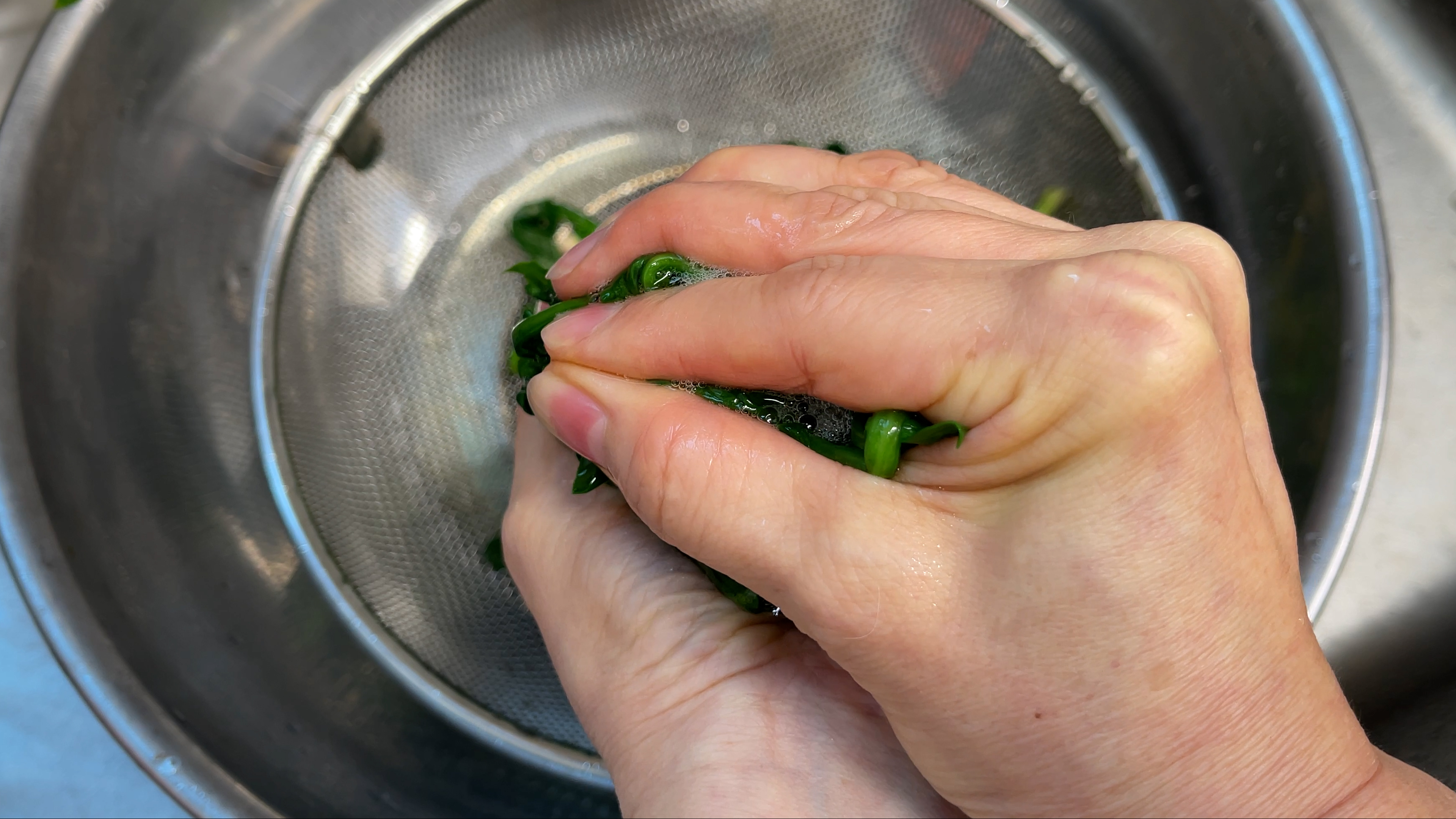 4. 시금치를 꼭 짠다. 시금치나물 사용 용도에 따라 크기를 자른다(김밥용은 그대로사용).