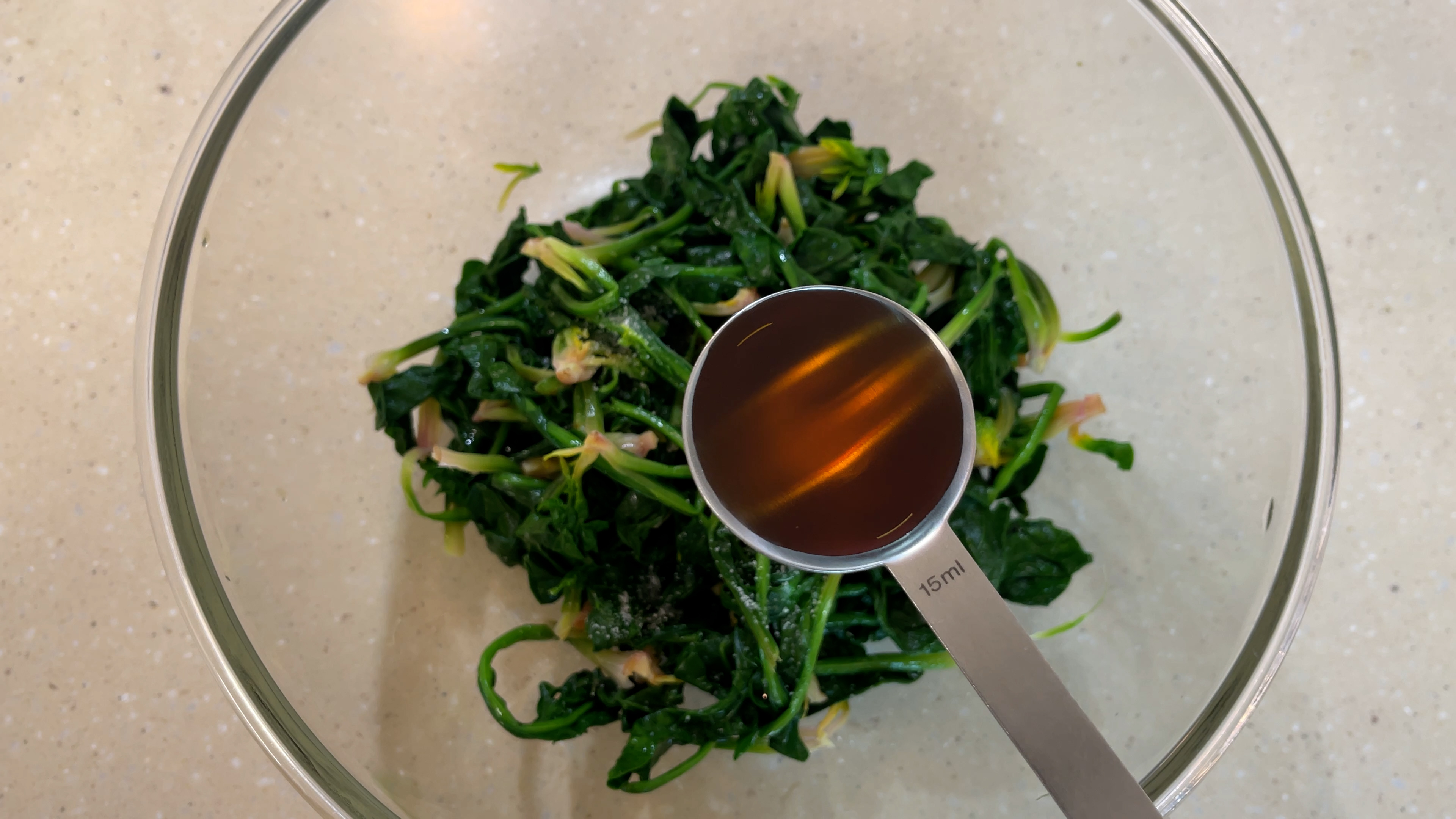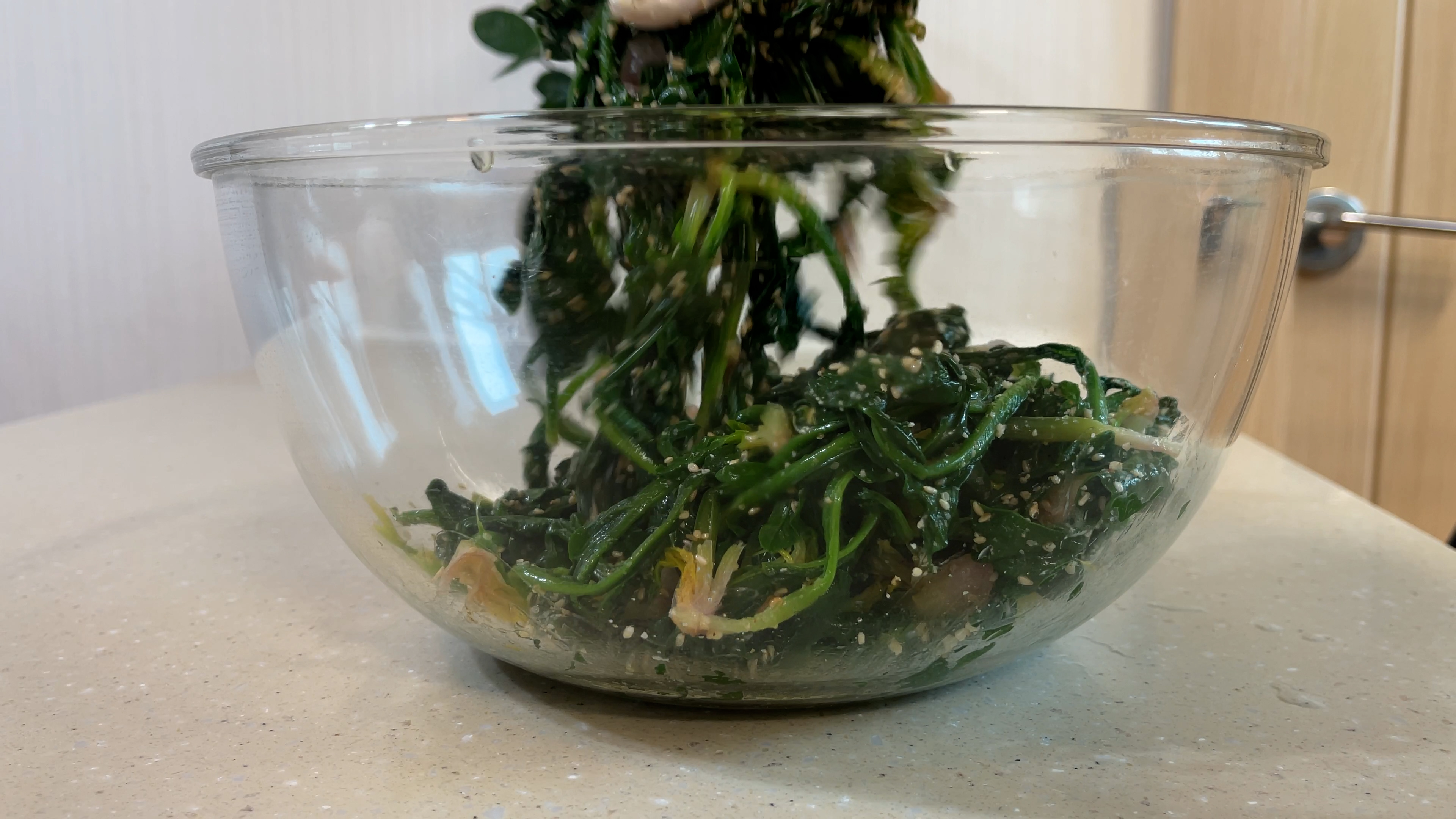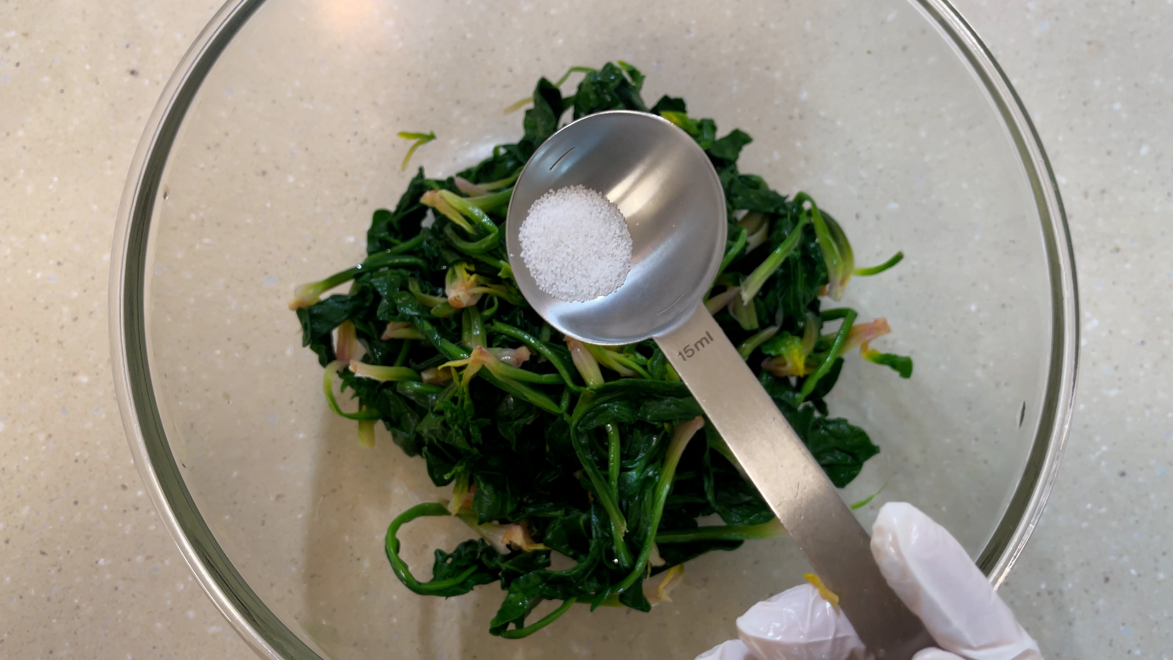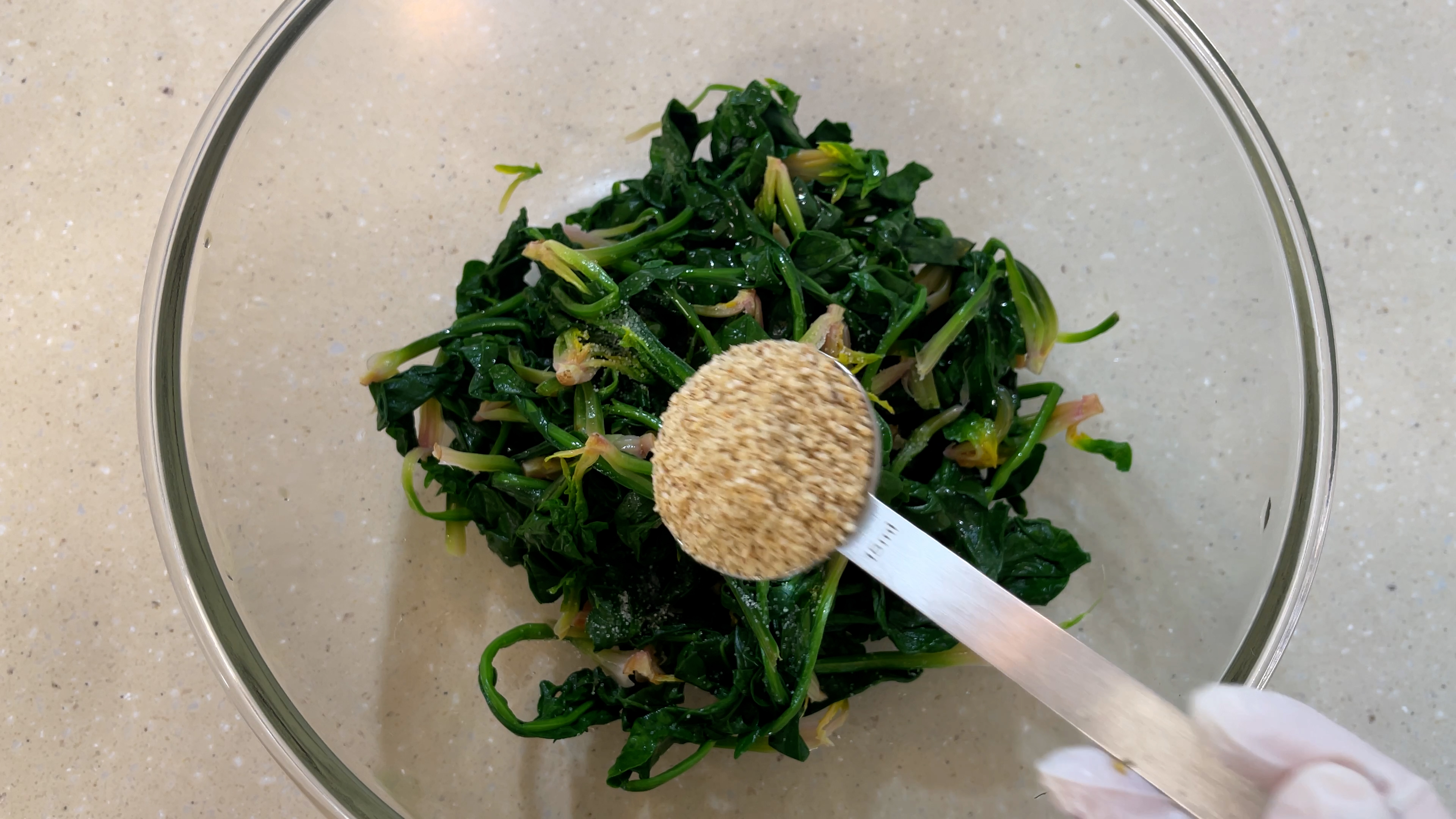 5. 시금치+ 맛소금+ 깨소금+ 참기름 넣는다.