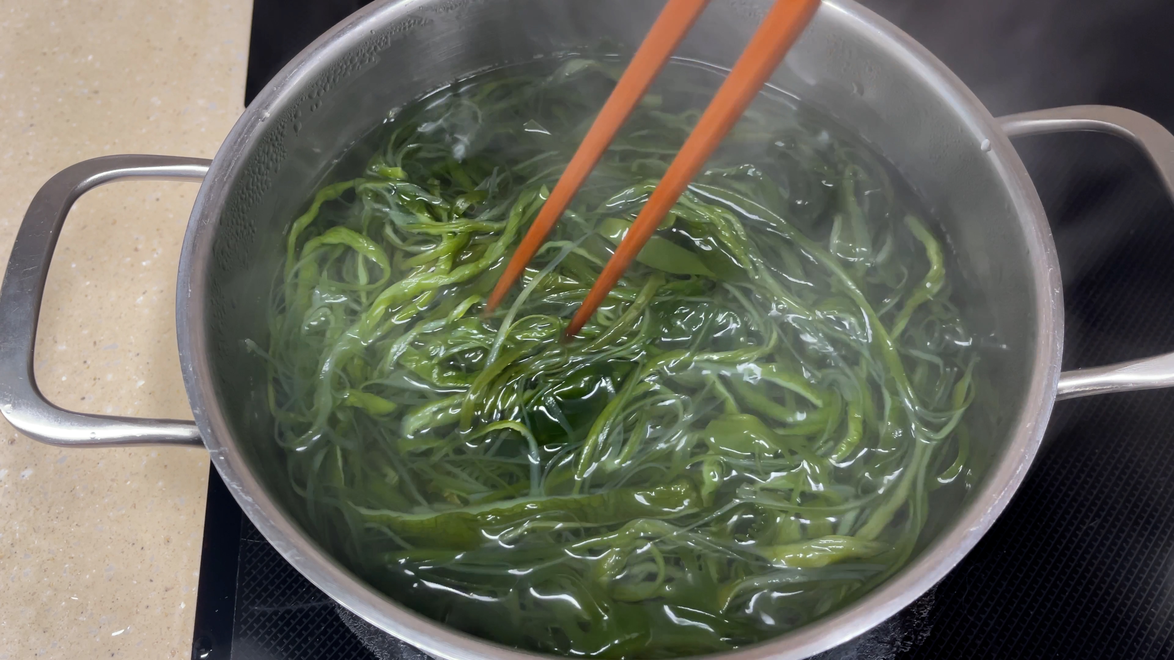 3. 끓는 물에 소주(식초)를 넣고 씻은 미역줄기를 넣고 10~15초 데친다.