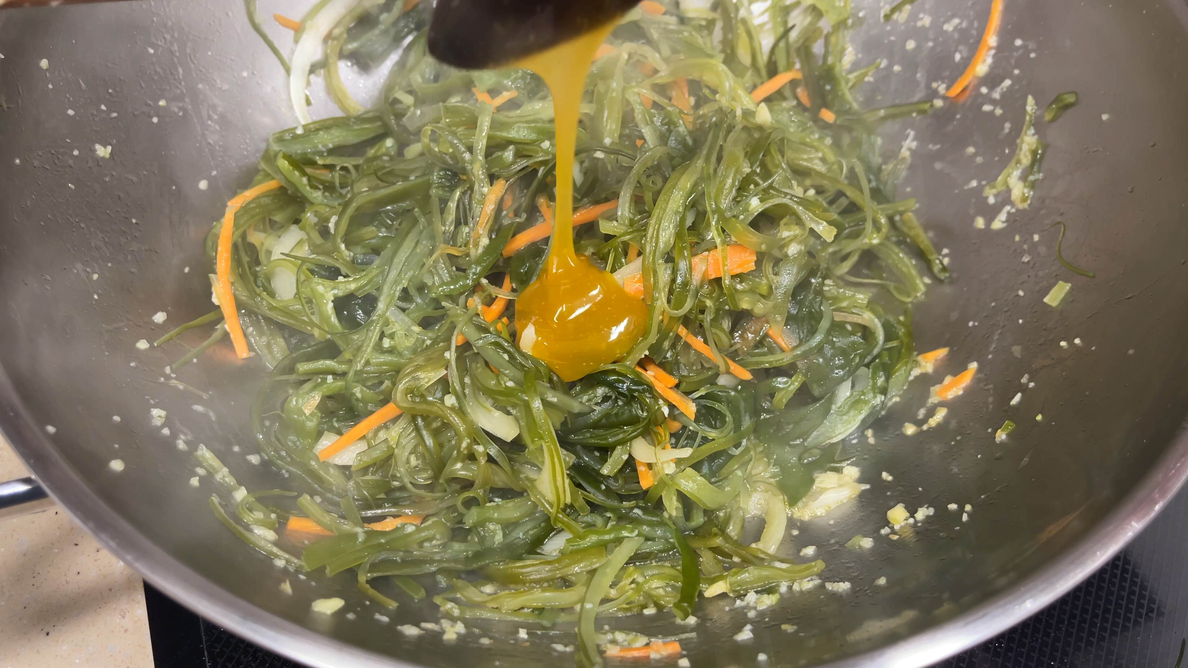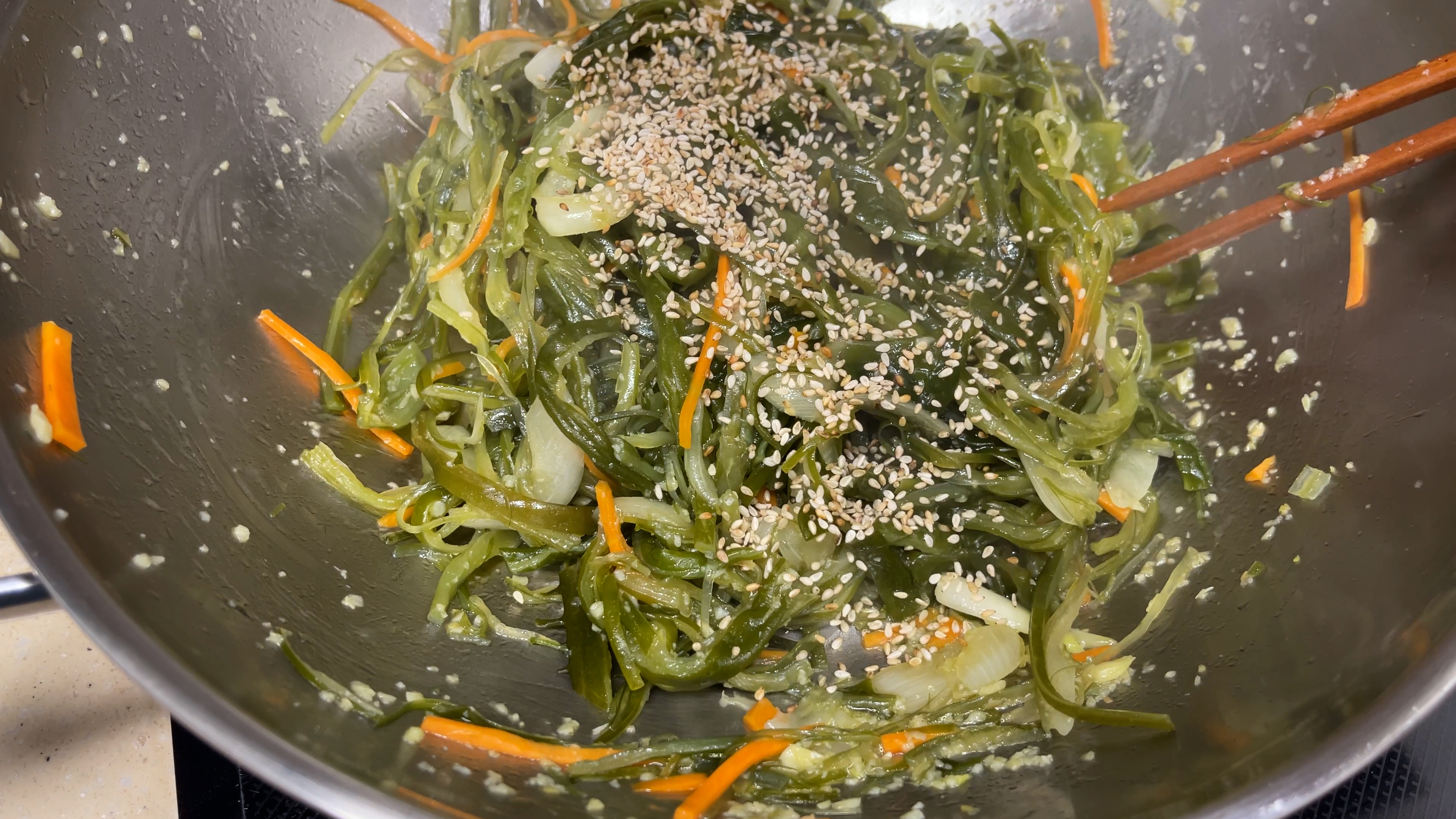 6. 맛술, 치킨스톡, 통깨를 넣어 미역줄기볶음을 완성한다.