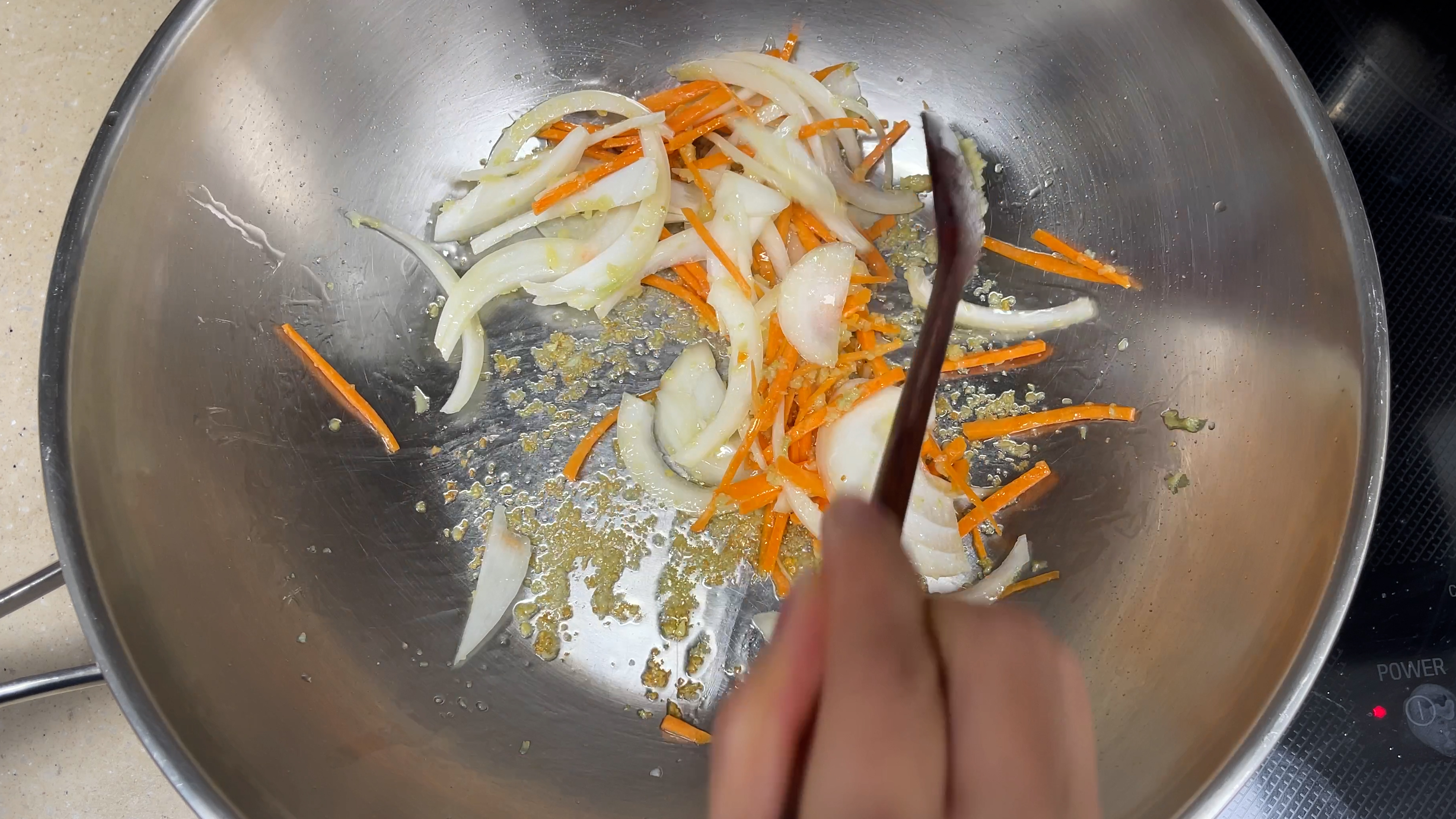 2. 양파와 당근 채 썰어 준비한다(채소 없으면 안 넣어도 된다).