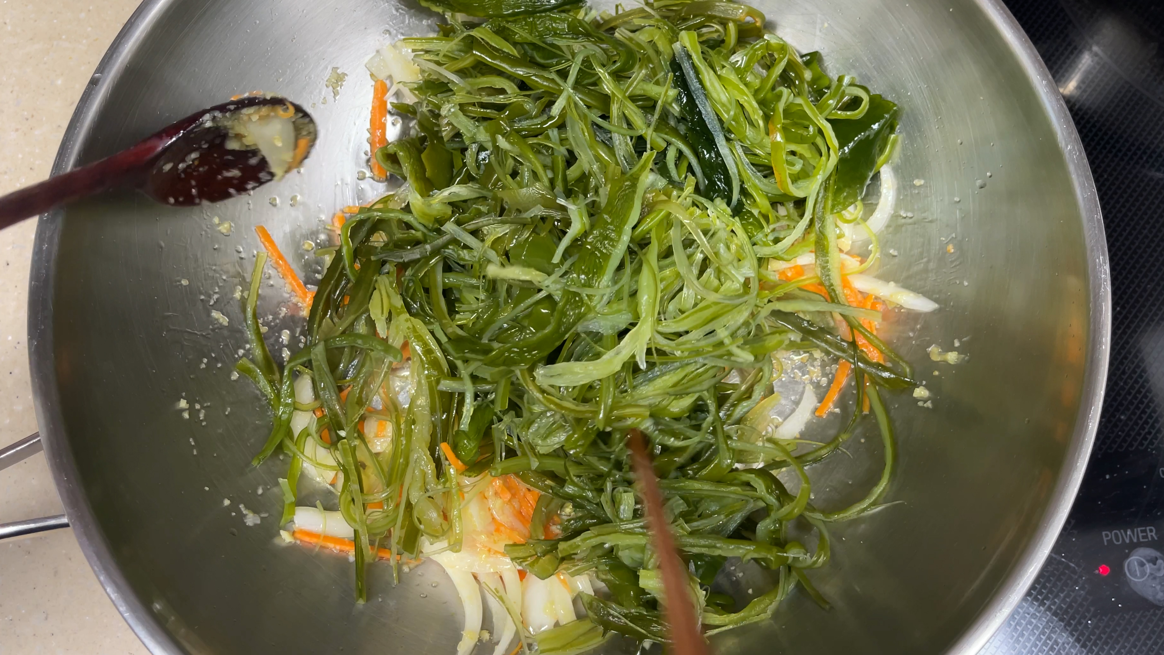 5. 후파이팬에 식용유 두르고 간 마늘 넣고 마늘향을 낸 후 채소와 미역줄기 넣고 볶아준다.