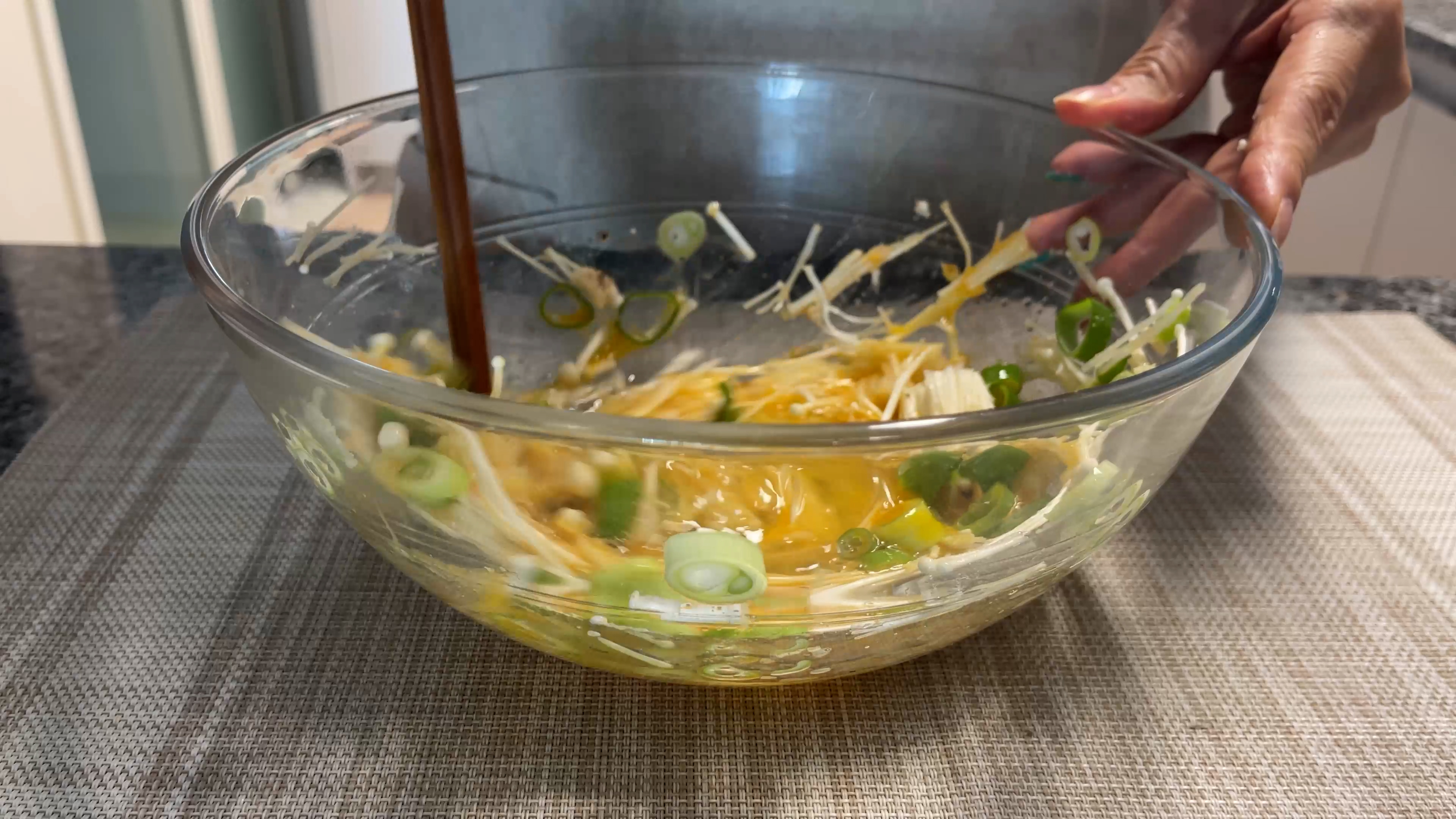 3. 보올에 파, 팽이버섯, 계란을 넣고 소금, 후추 조금씩 넣고 잘 섞어준다.