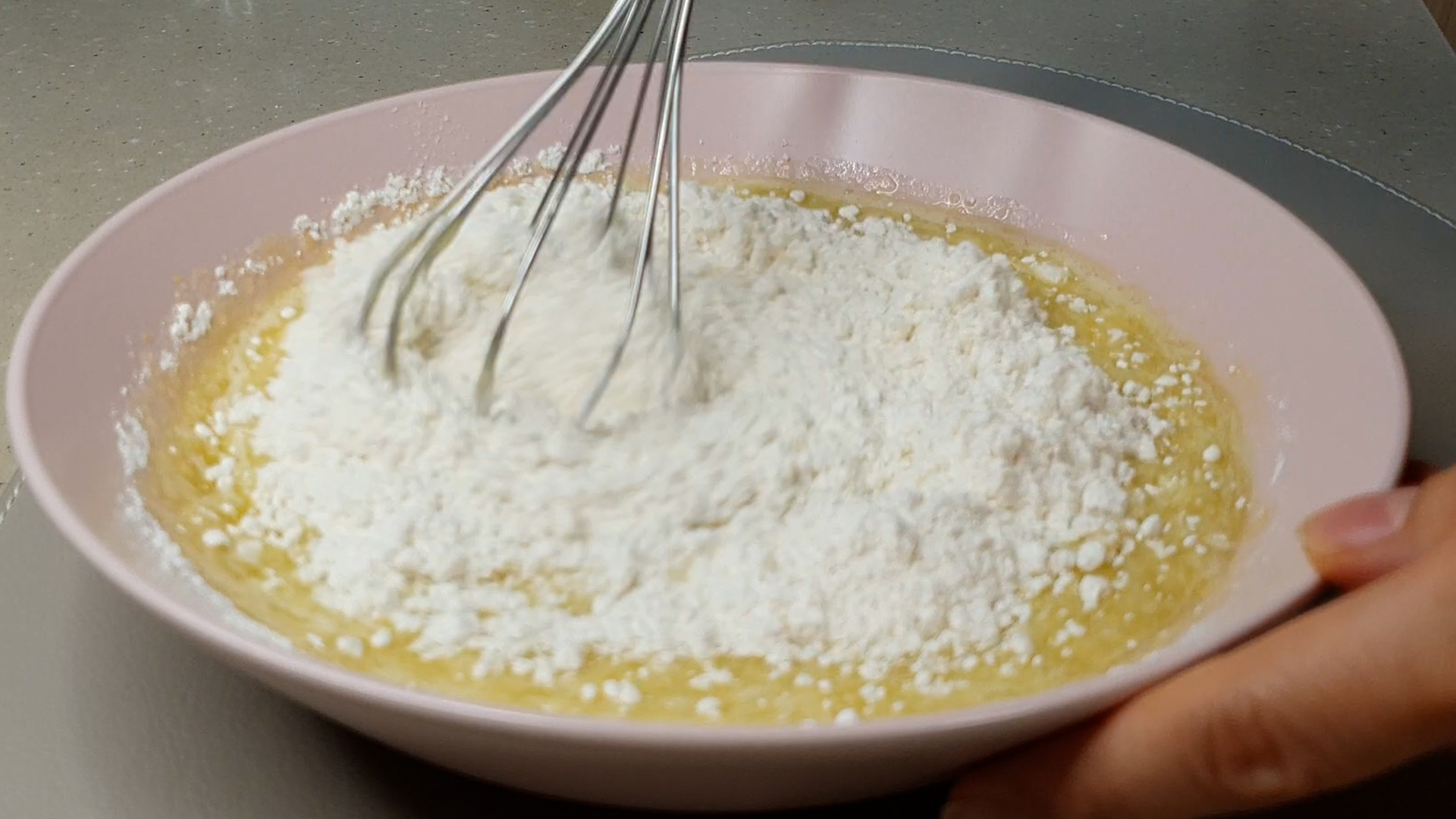 2. 바닐라 익스트랙, 우유, 올리브 오일, 베이킹 파우더, 밀가루 넣고 잘 섞어 준비한다.