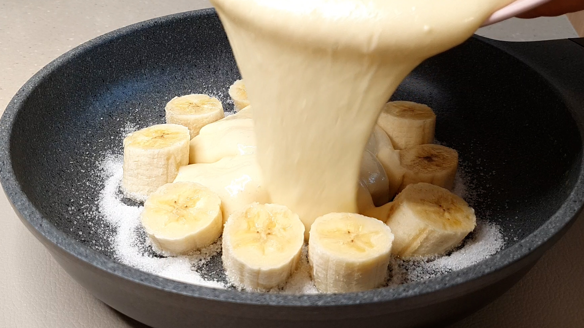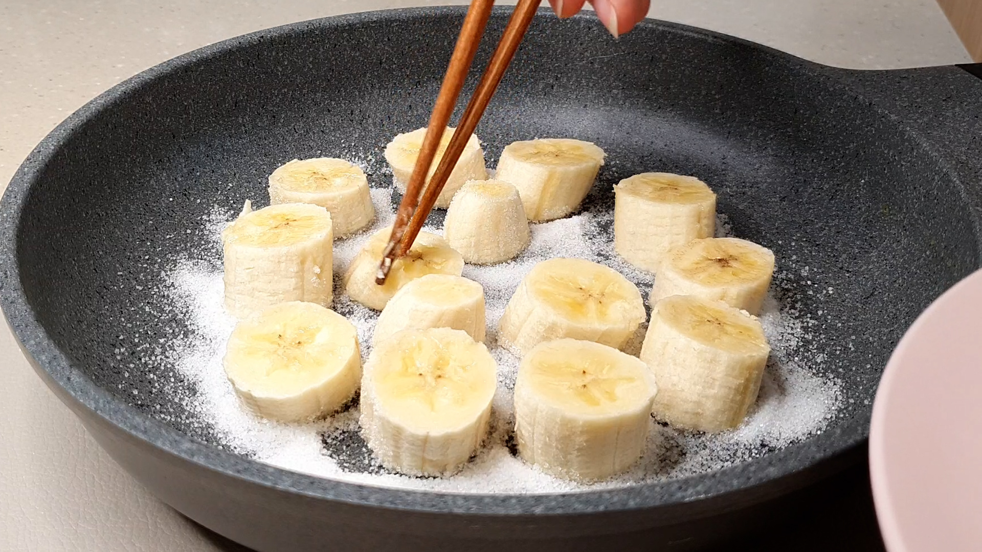 2. 프라이팬에 설탕 뿌리고 잘라 놓은 바나나 올려 준다.