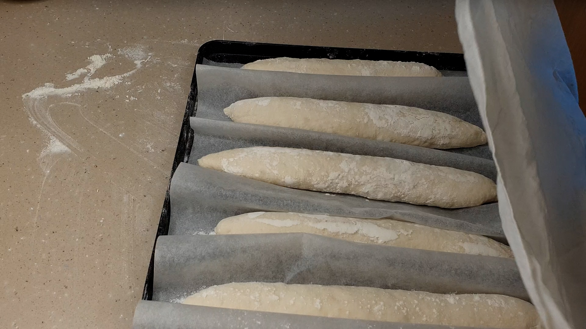 4. 종이호일 위에 밀가루 뿌리고 바게트 반죽 올리고 2차 발효 30분 한다.