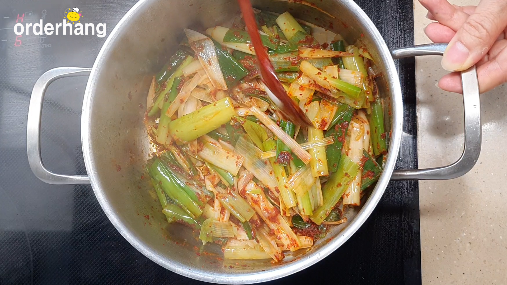 5. 대파가 살짝 익으면 불을 끈 후, 고춧가루를 넣어 고추기름을 만들어준다.