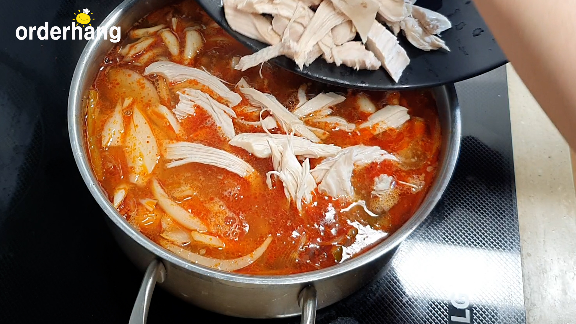 6.닭가슴살 삶은 육수와 준비한 양파, 버섯, 닭가슴살 넣고, 국간장, 다진마늘, 생강등 넣어 끓인다.