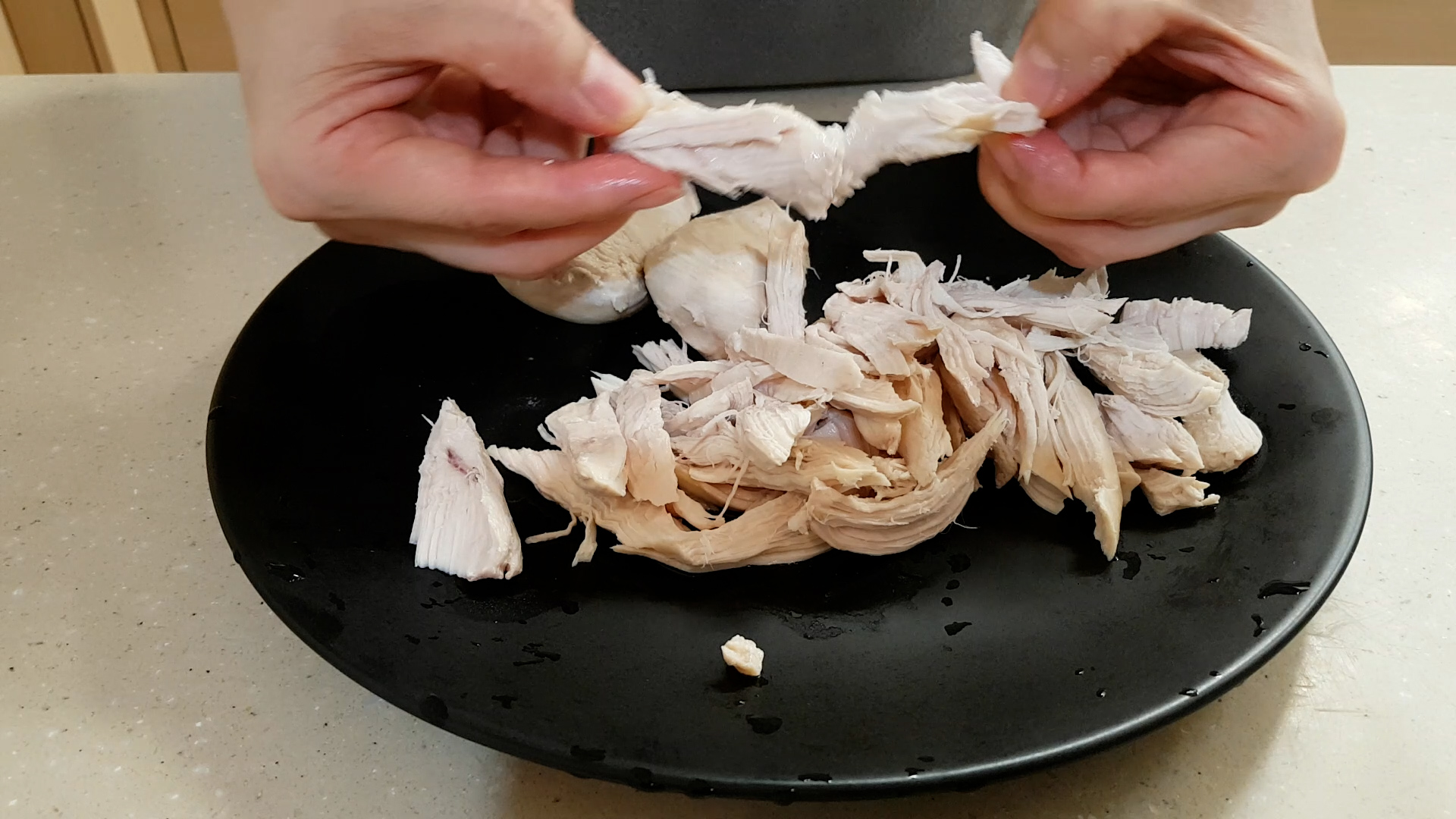3.삶은 닭가슴살은 한 김 식혀 결대로 먹기 좋은 크기로 찢어준다.