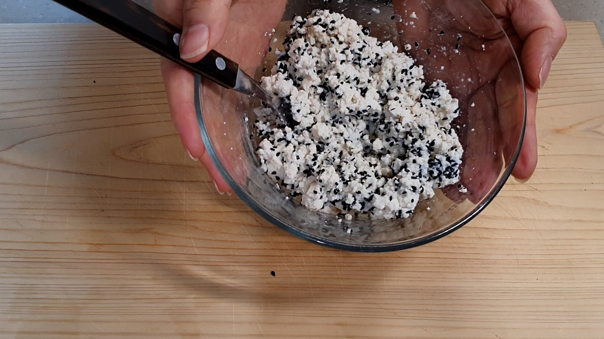 2. 두부에 소금, 후추 살짝 뿌린 후 검정깨 넣어 잘 섞어 준다.