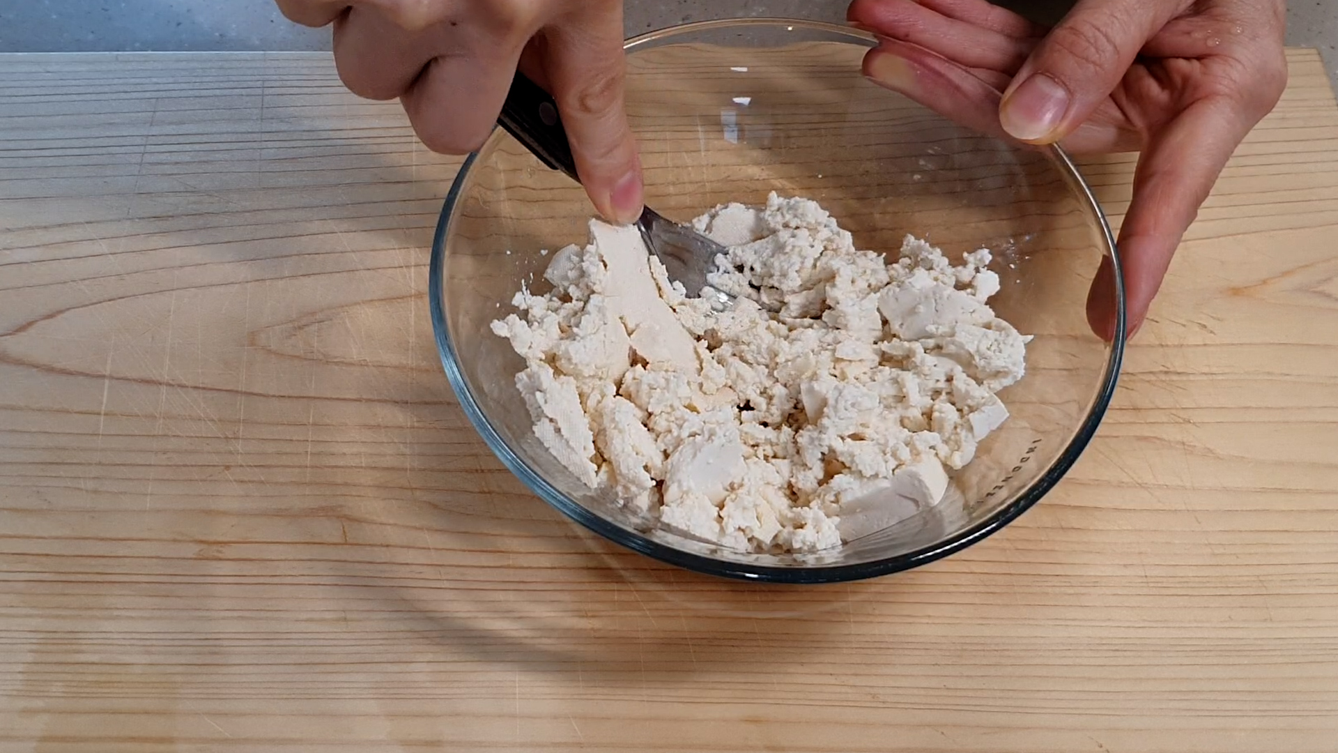 1. 두부를 키친타올로 물기를 제거하여 으깨 준다.